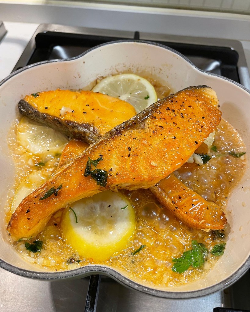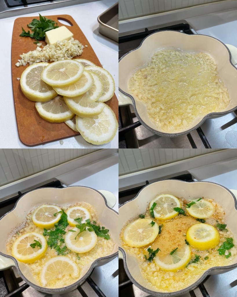 4. 熱鍋下牛油,加入蒜蓉輕輕炒香,再加入Parsley碎、蜜糖和檸檬!煮1-2分鐘,可加入三文魚煮30秒或直接倒在三文魚上!