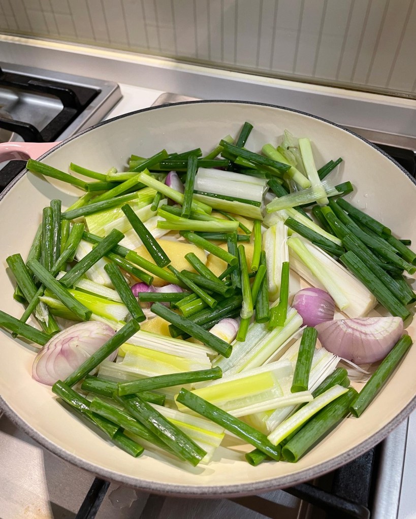 3) 鍋中先倒入油,放上薑片,之後平均地放上葱、乾葱和大葱,再放上雞 (連埋醃雞的汁一起倒下)