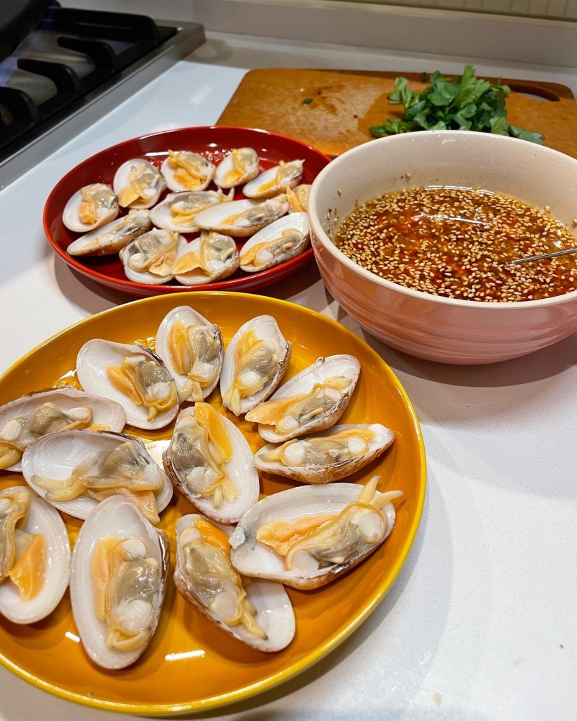 1. 花甲先浸洗,鍋中水滾後加入花甲煮至開口,拿起沖一沖凍水,再移走另一邊殼!排在碟上備用!