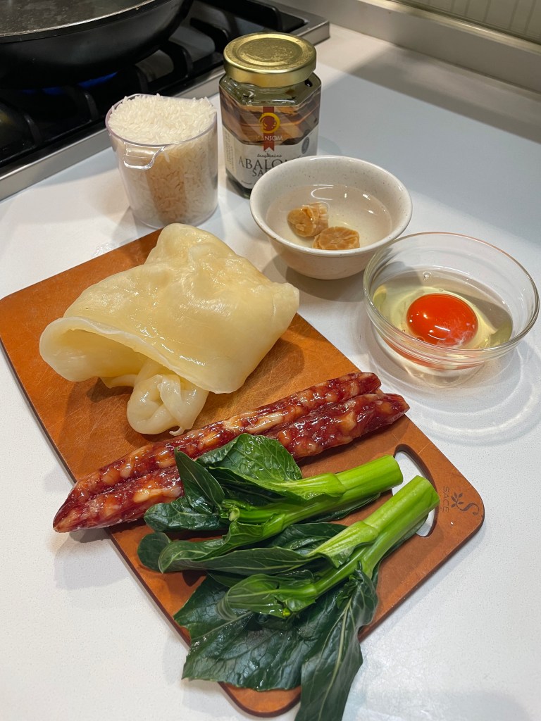 4) 鍋底抹1茶匙油,米洗淨後加入同等份量的水,再加多1茶匙鮑汁攪拌一下,蓋上鍋蓋以中火煮至鍋蓋緣有蒸汽冒出,再轉小火繼續煮約10分鐘至收水,之後放上臘腸、花膠、瑤柱碎,繼續煮5分鐘,再加入雞蛋煮多3分鐘,放上菜心,倒上甜豉油即成