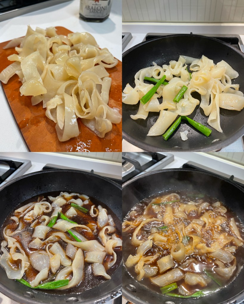 3) 花膠發好後,切粗條,煲中下油爆香蒜頭和蔥,快手下花膠輕炒後下雞湯和其他調味料,轉小火炆煮20分鐘