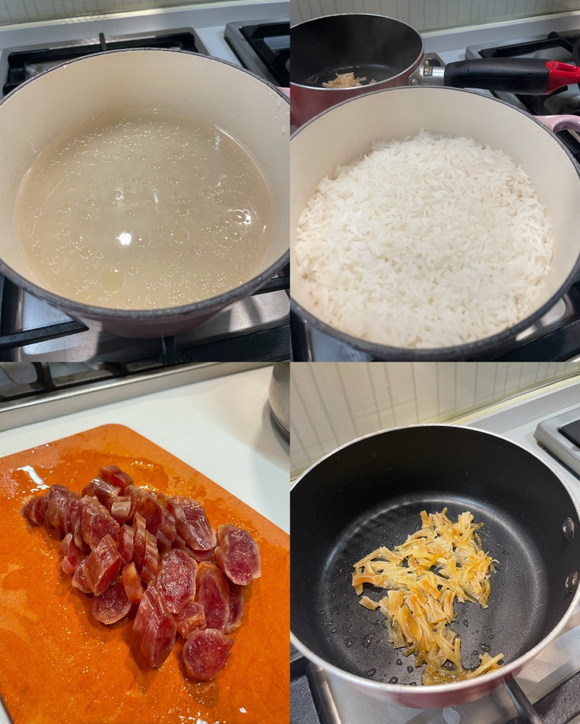 2) 瑤柱浸淋之後用油煎香,臘腸放入滾水煮3分鐘,切片備用,菜心用滾水煮熟