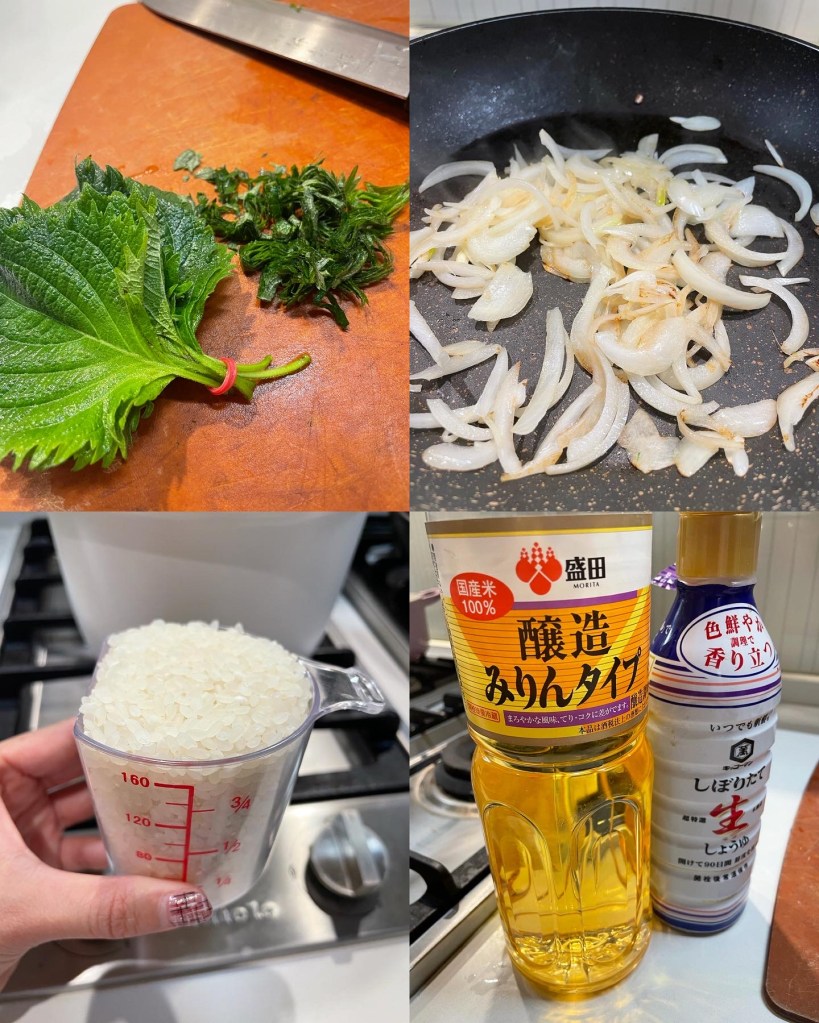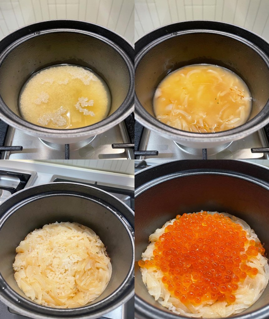 2)鍋中加入米,柴魚高湯、醬油、味醂和清酒攪拌均勻,然後再加入洋蔥攪拌均勻,開中火,湯滾後轉細火加蓋煮15-20分鐘或至飯乾身,再轉大火1分鐘後熄火,焗5分鐘