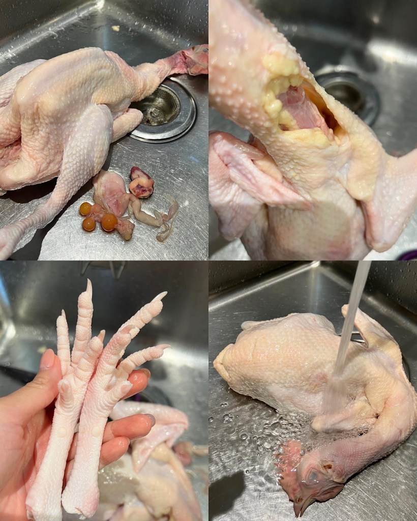 1) 全雞洗淨,先將多餘的雞脂肪切出,留起備用 ,切去雞腳,把雞身的內臟徹底清走,雞頸開一個洞
