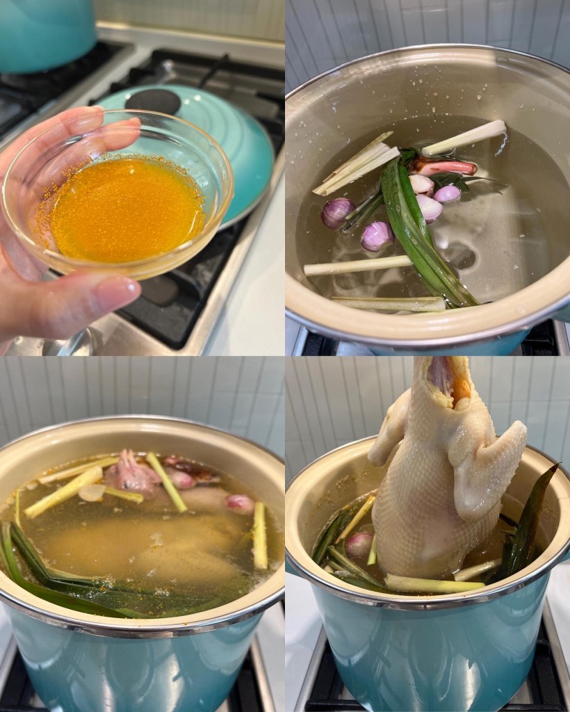 3) 除雞以外,所有材料加入水中煲滾後繼續煲5分鐘,水的份量要足夠蓋過全隻雞