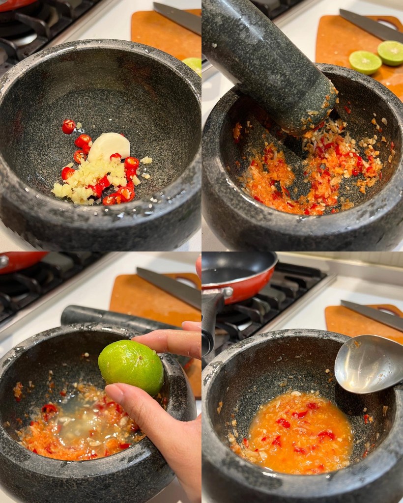 兩條指天椒、一湯匙蒜蓉和一茶匙薑蓉弄碎,然後加入一個青檸汁