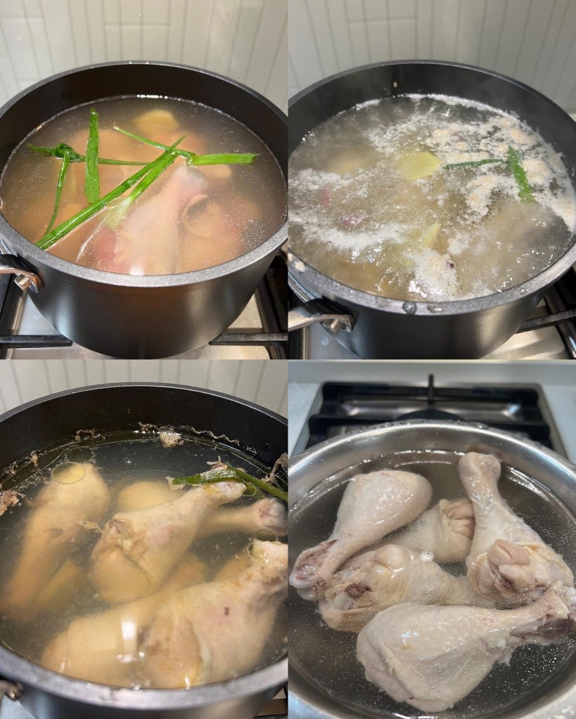 2) 凍水加入雞鎚和所有浸雞材料,開細火,水的分量一定要足夠蓋過所有雞鎚,水滾後繼續用細火,微滾的狀態下,合蓋煮15分鐘