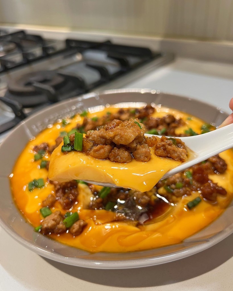 2湯匙薑蓉、1/2茶匙五香粉、1/2茶匙鹽和1/4茶匙糖攪拌均勻,然後倒入兩湯匙滾油