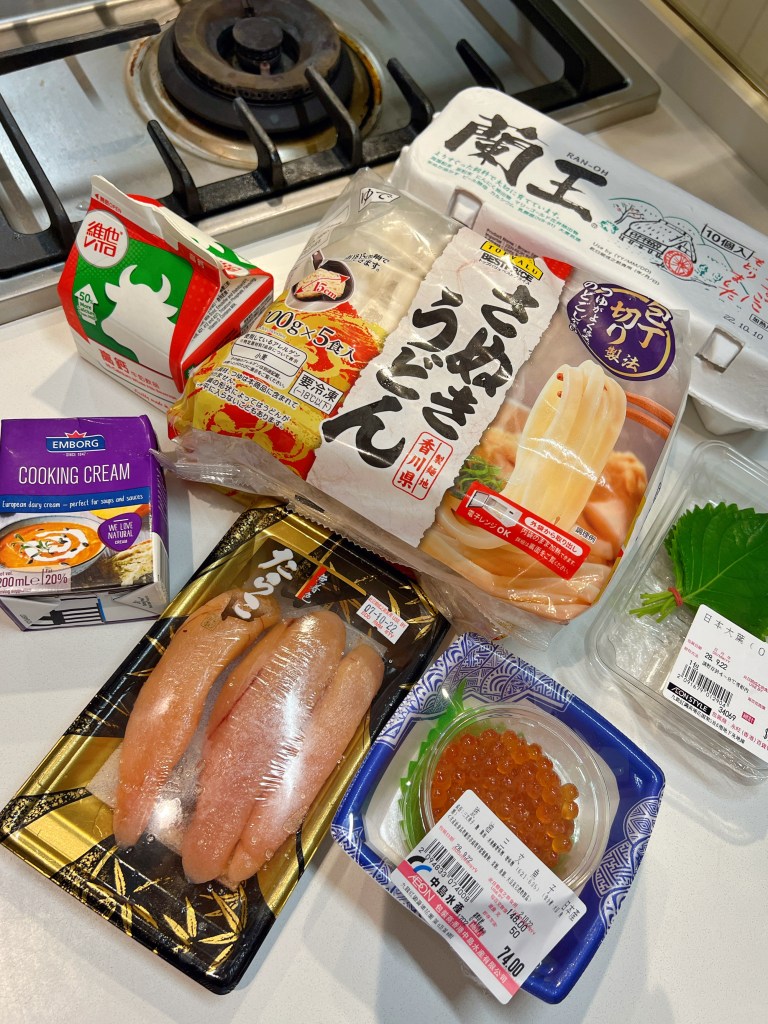 3) 之後加入烏冬和明太子汁撈在一起,煮約1-2分鐘至醬汁濃稠,再拌上其他裝飾物即成