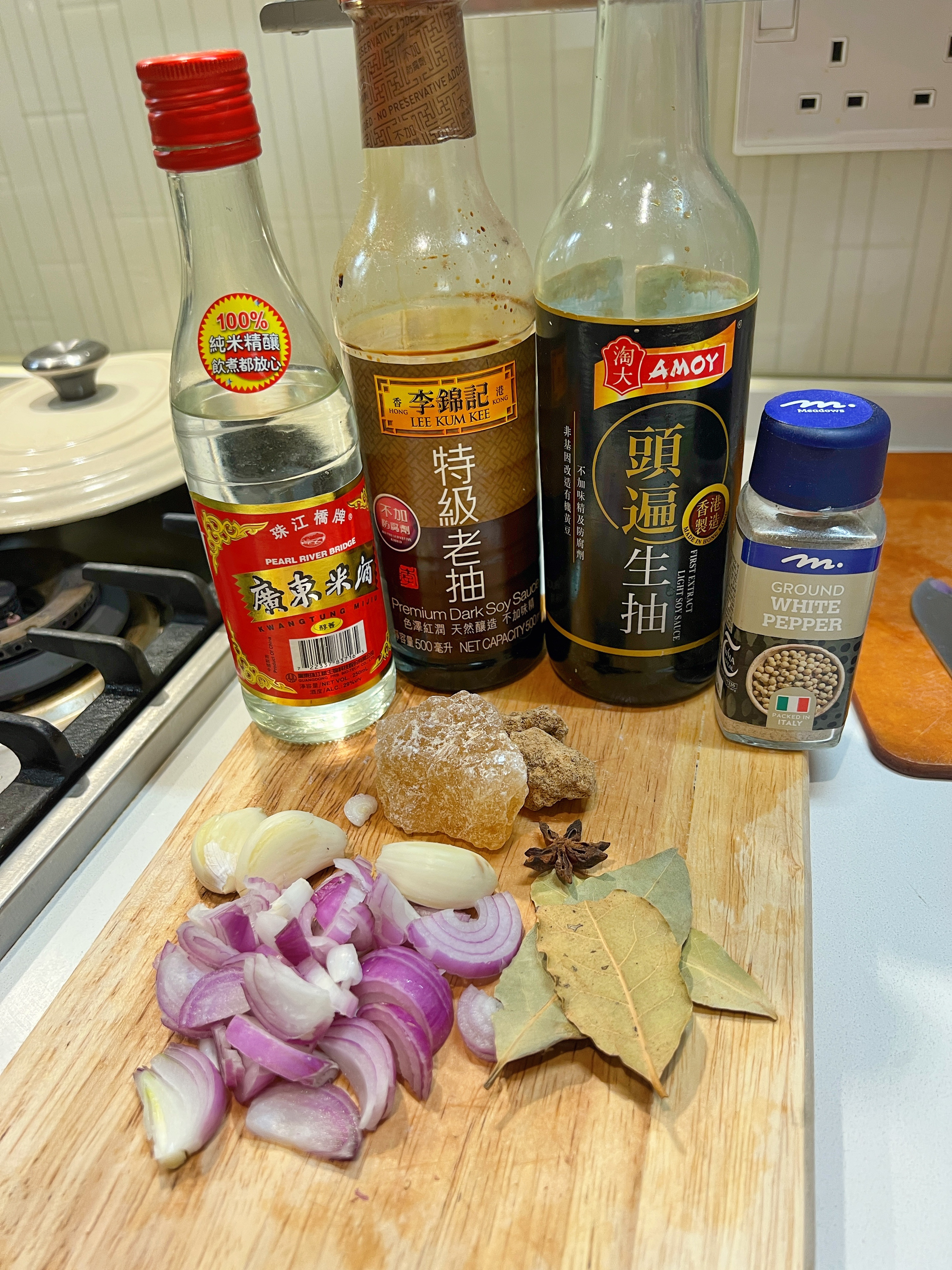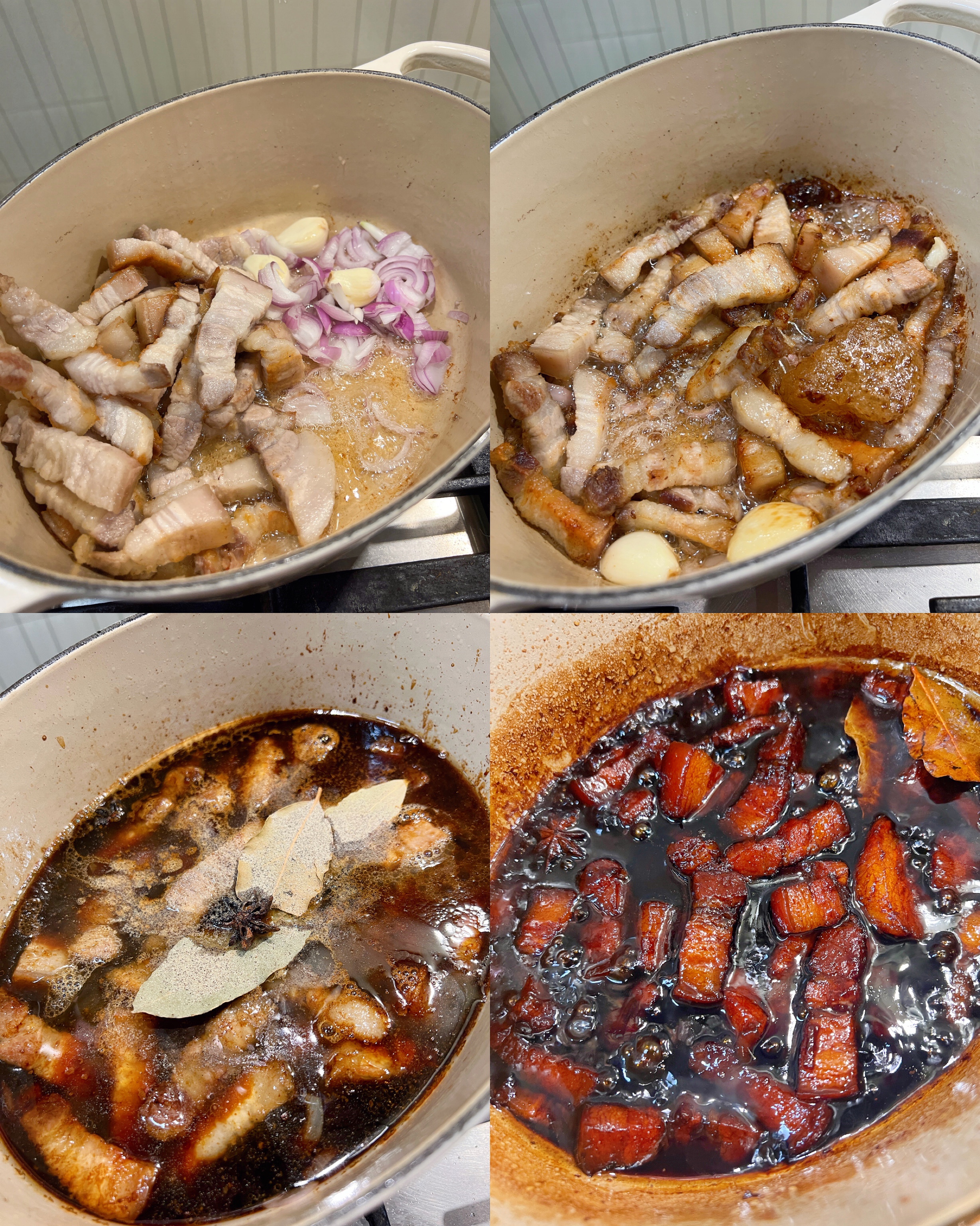 - 鍋中下少少油,把豬肉方塊加入,兩面煎至微黃色,迫出油份,之後可倒去過多的油份!加入蒜頭和乾蔥頭炒香,再加入糖炒至微微溶化,之後倒進酒,再加入其他調味料!煮滾後轉小火,上蓋炆約1小時至豬肉軟稔,再轉中大火開蓋煮5-10分鐘把醬汁煮至厚身!