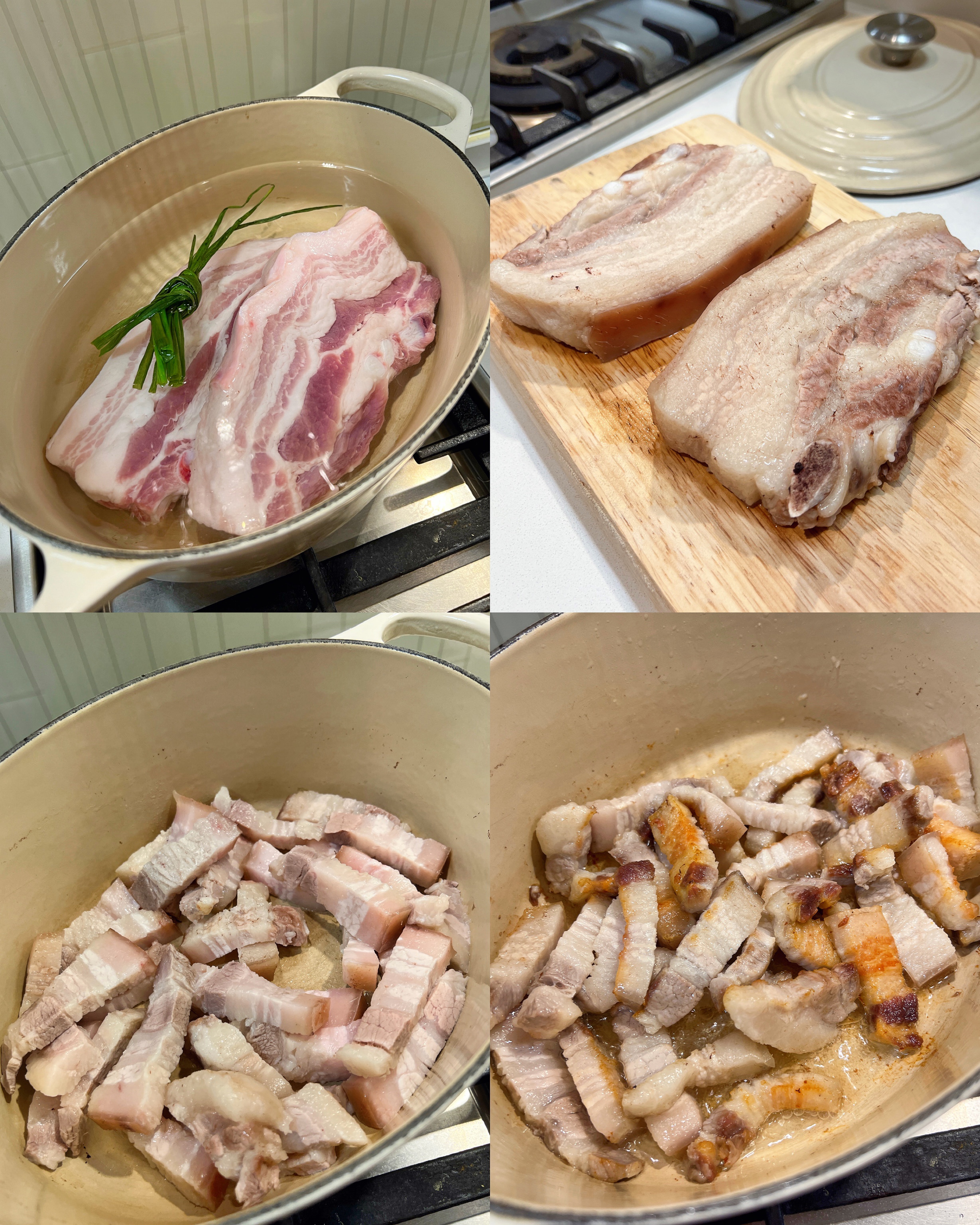 - 豬肉加入一小扎蔥和水煮滾,繼續煮5分鐘,拎出沖水至冷卻,之後切成1cm闊長塊,再切成細長條!豬皮上的毛可事先叫肉檔去掉!