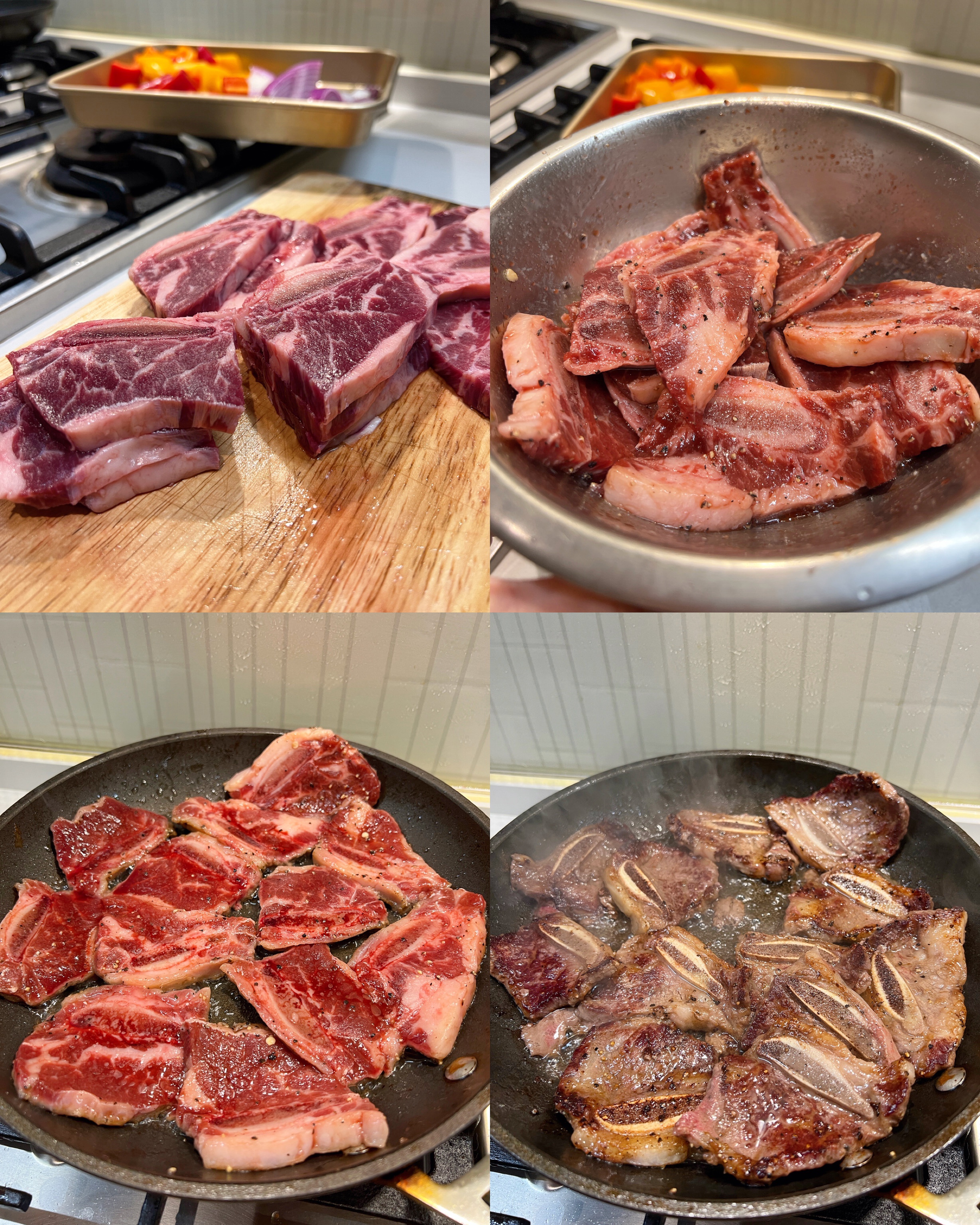 2) Add 1-2tbsp oil to pan, pan fry the beef short ribs for 1 min on each side with high heat, cook until 80% done, set aside