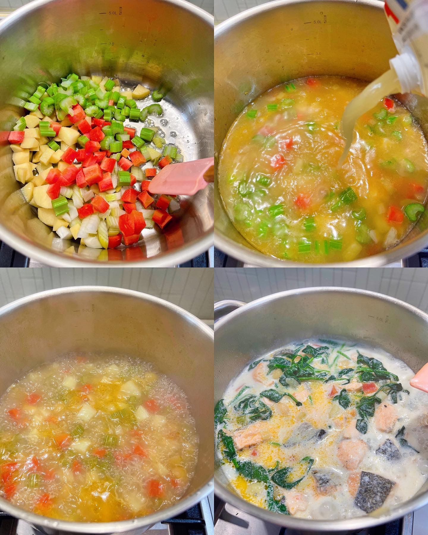4) 用少許油炒香雜菜粒,然後倒入雞湯,中火煮15分鐘!之後加入通心粉煮7分鐘!然後倒入牛奶,再把三文魚和菠菜加入,煮5分鐘,再加入麵糊不斷攪拌至濃厚,最後加入黑胡椒和海鹽調味即成