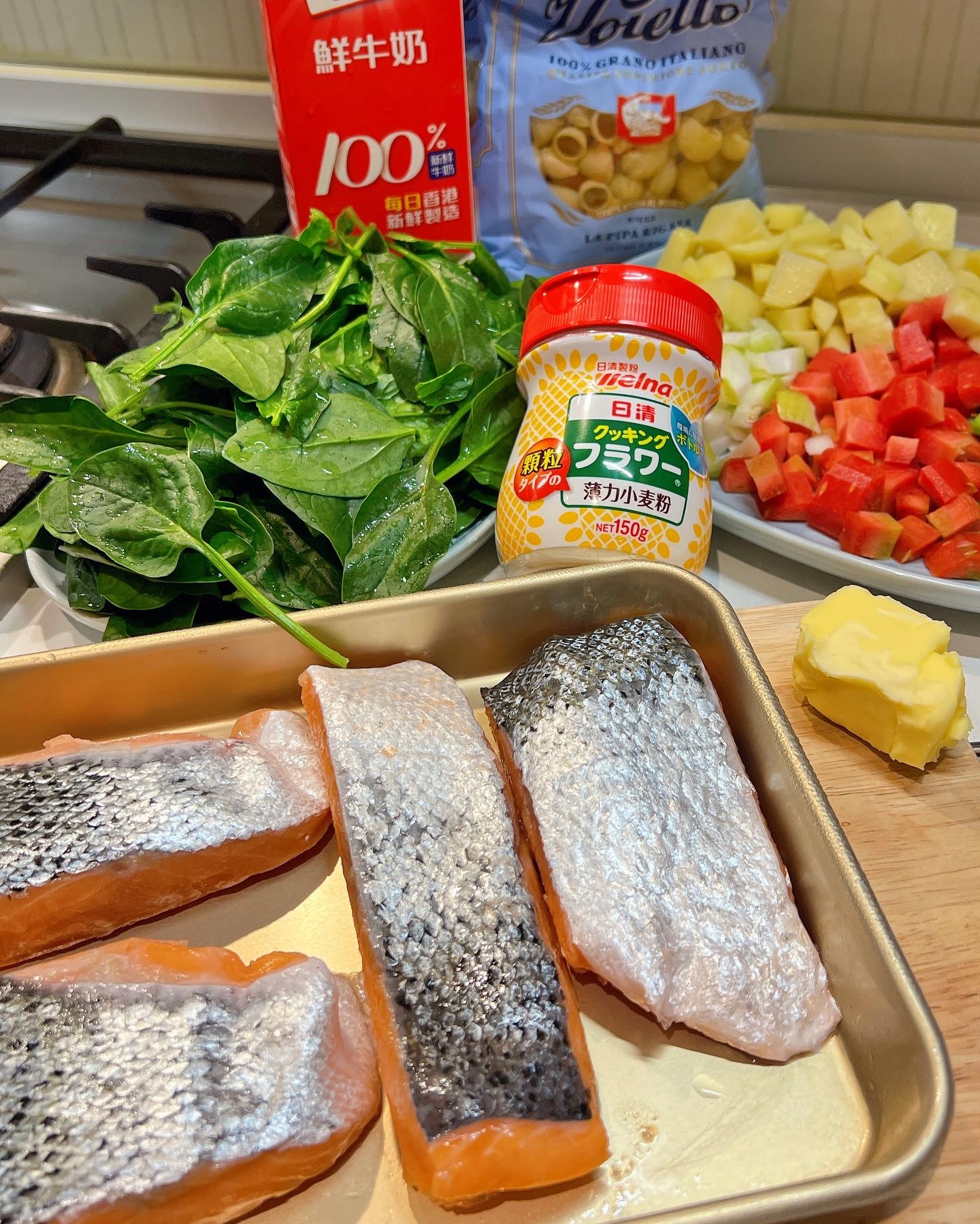 1) 雜菜(西芹 蘿蔔 洋蔥 薯仔)全部去皮切粒!菠菜洗淨剪去根部!三文魚兩邊灑上鹽和黑椒!