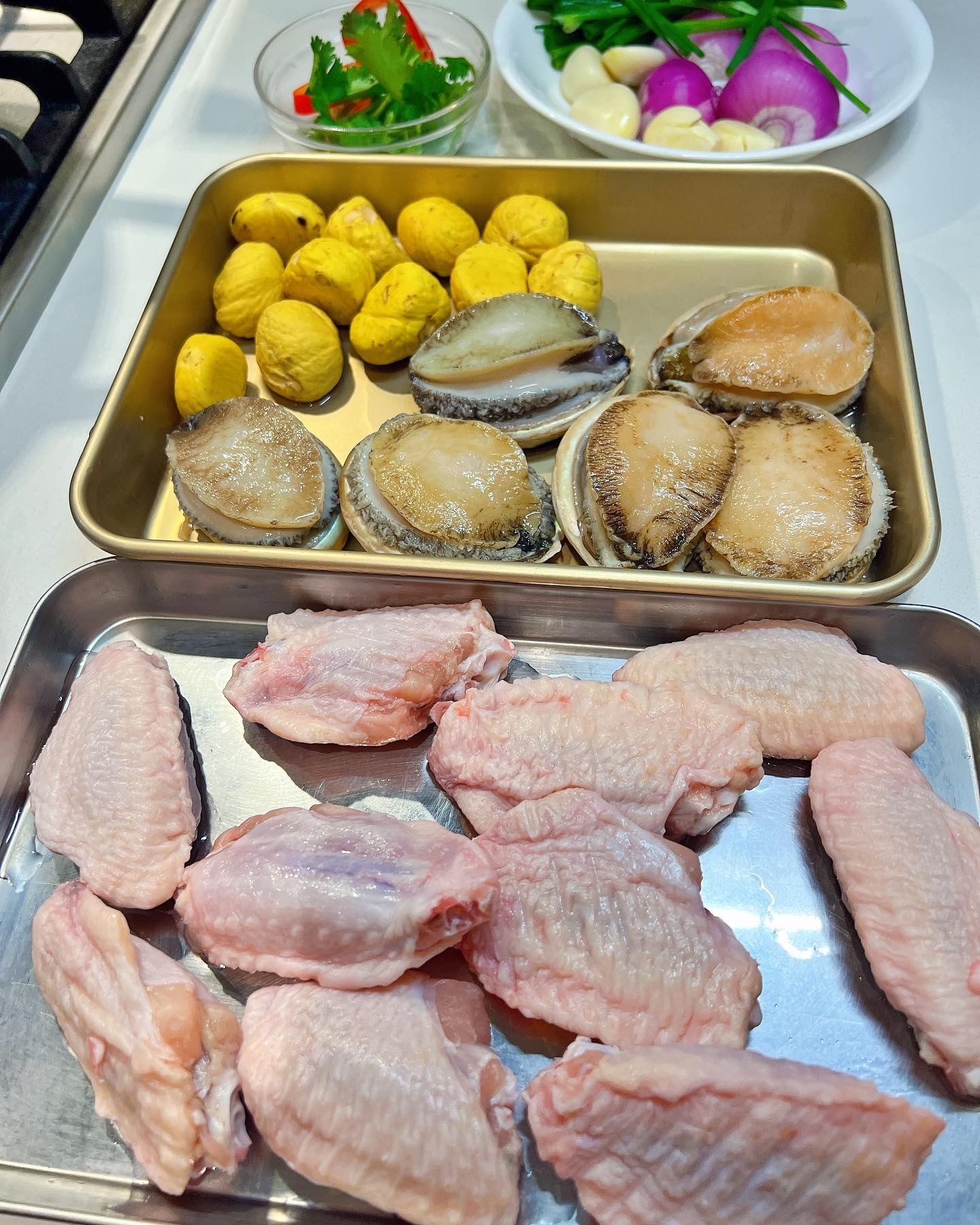 1) 雞翼加醃料醃半小時,鮑魚去殻洗淨,乾蒽頭去皮切半,蒜頭去皮拍一拍