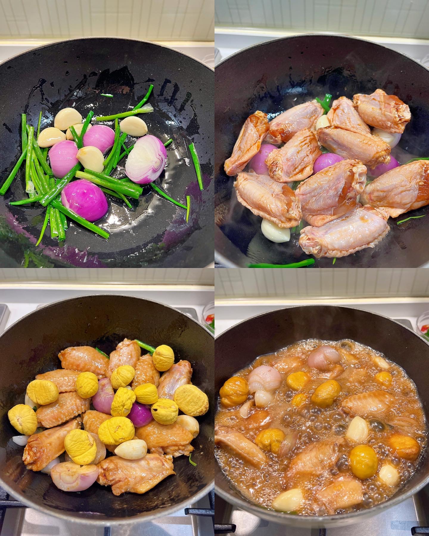 2) 熱鍋下油,大火落蒽段、乾蒽頭和蒜頭爆香,加入雞翼炒勻,下栗子和調味料轉小火煮約20-30分鐘至汁濃,再加鮑魚煮5分鐘,加入蒽花即成