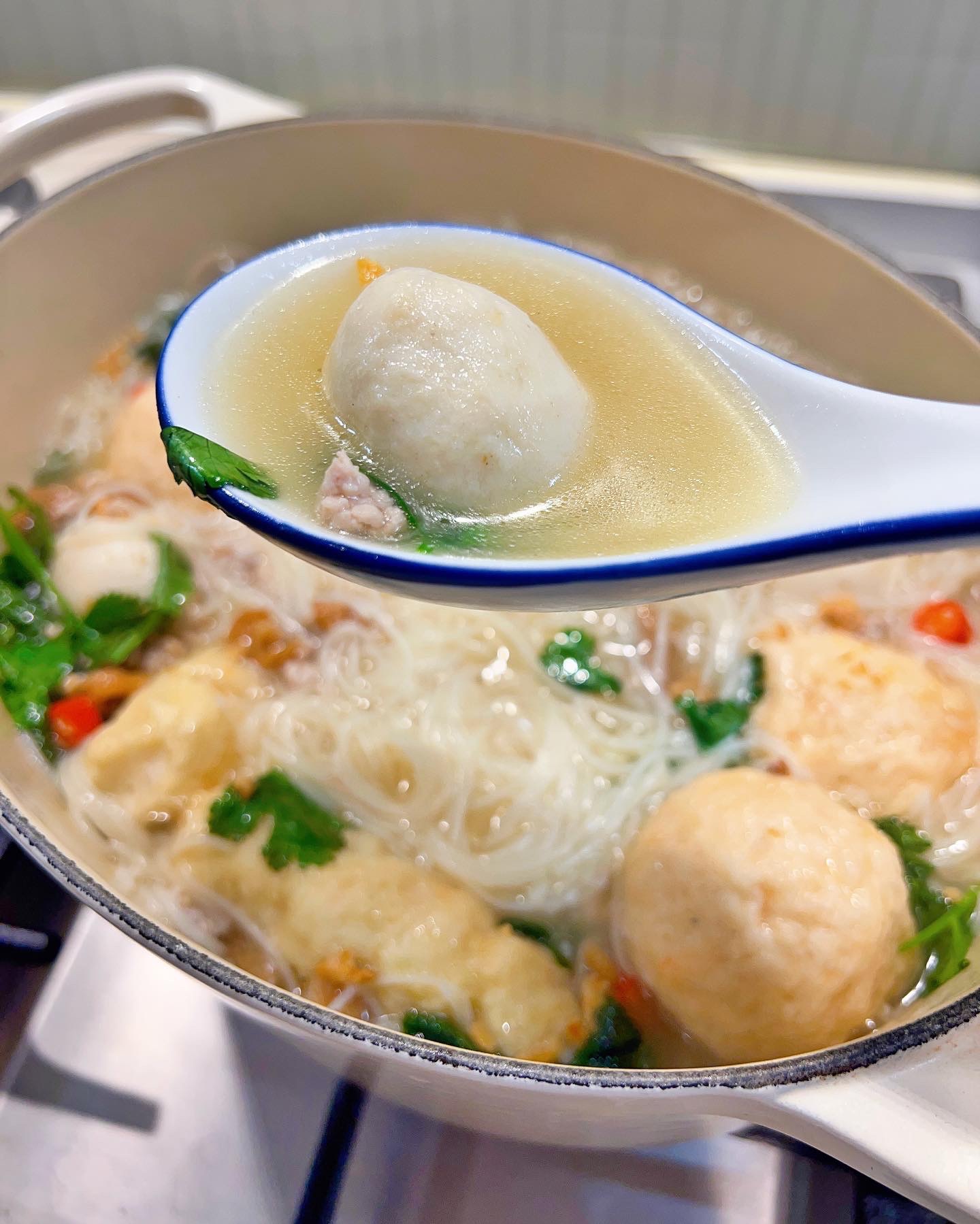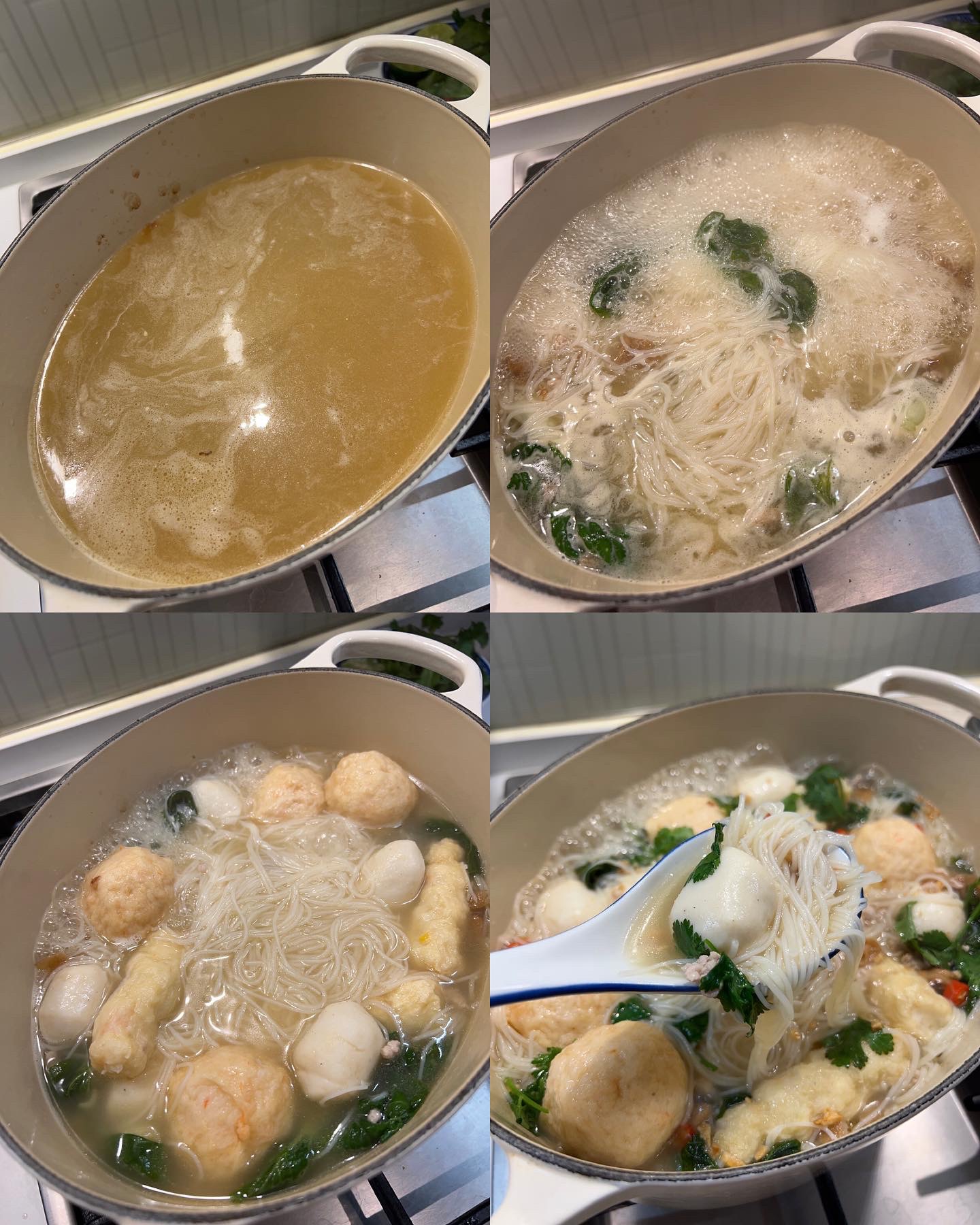 1) 鍋加入少許油爆香豬肉碎和菜脯,約2分鐘!之後便可以加入雞湯,煮滾後加入米粉煮約5分鐘,然後加入丸類煮熟即成!可加入芫荽、辣椒粒、炸蒜和胡椒粉調味✌🏻