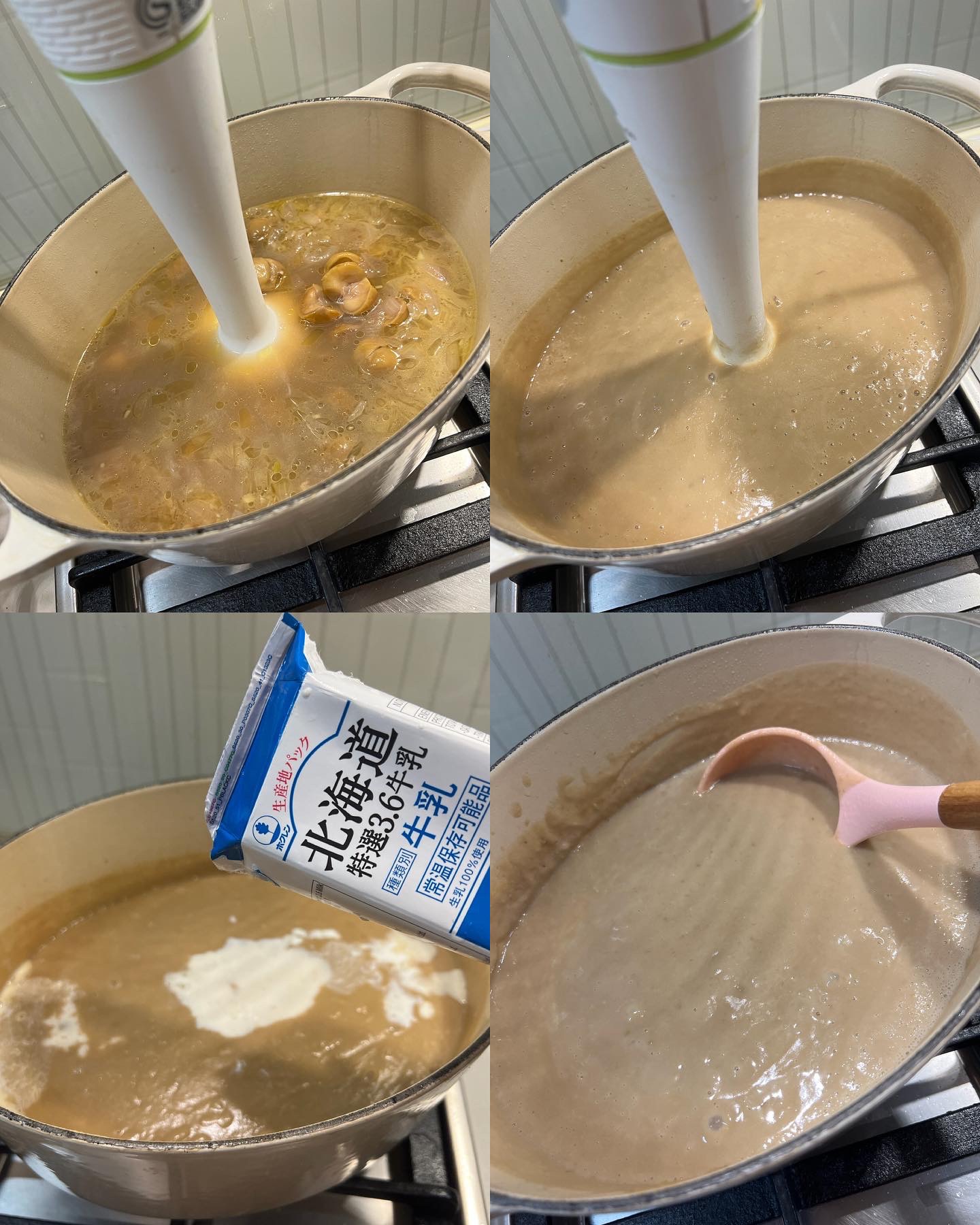 3) 用手提攪拌器把所有材料打爛成蓉,再開小火,倒入牛奶和淡忌廉,加入適量的鹽及黑椒調味拌勻,小火煮約1分鐘即成