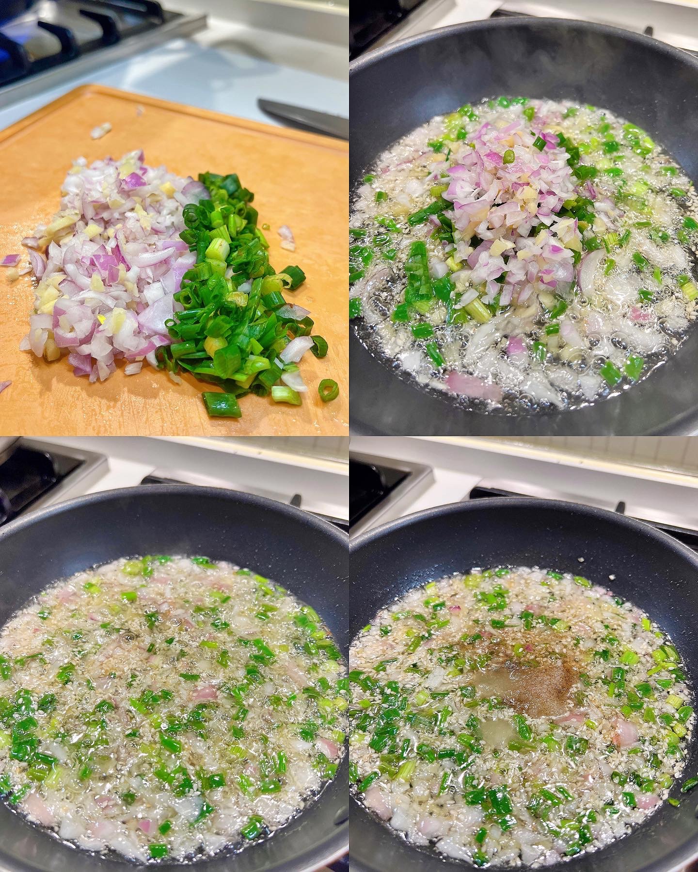 4) Heat oil in a pan and add in the green onion, garlic, shallot and sesame, cook for 3mins. Then season with sugar, white pepper and salt. Mix into the chicken and add onto the rice.