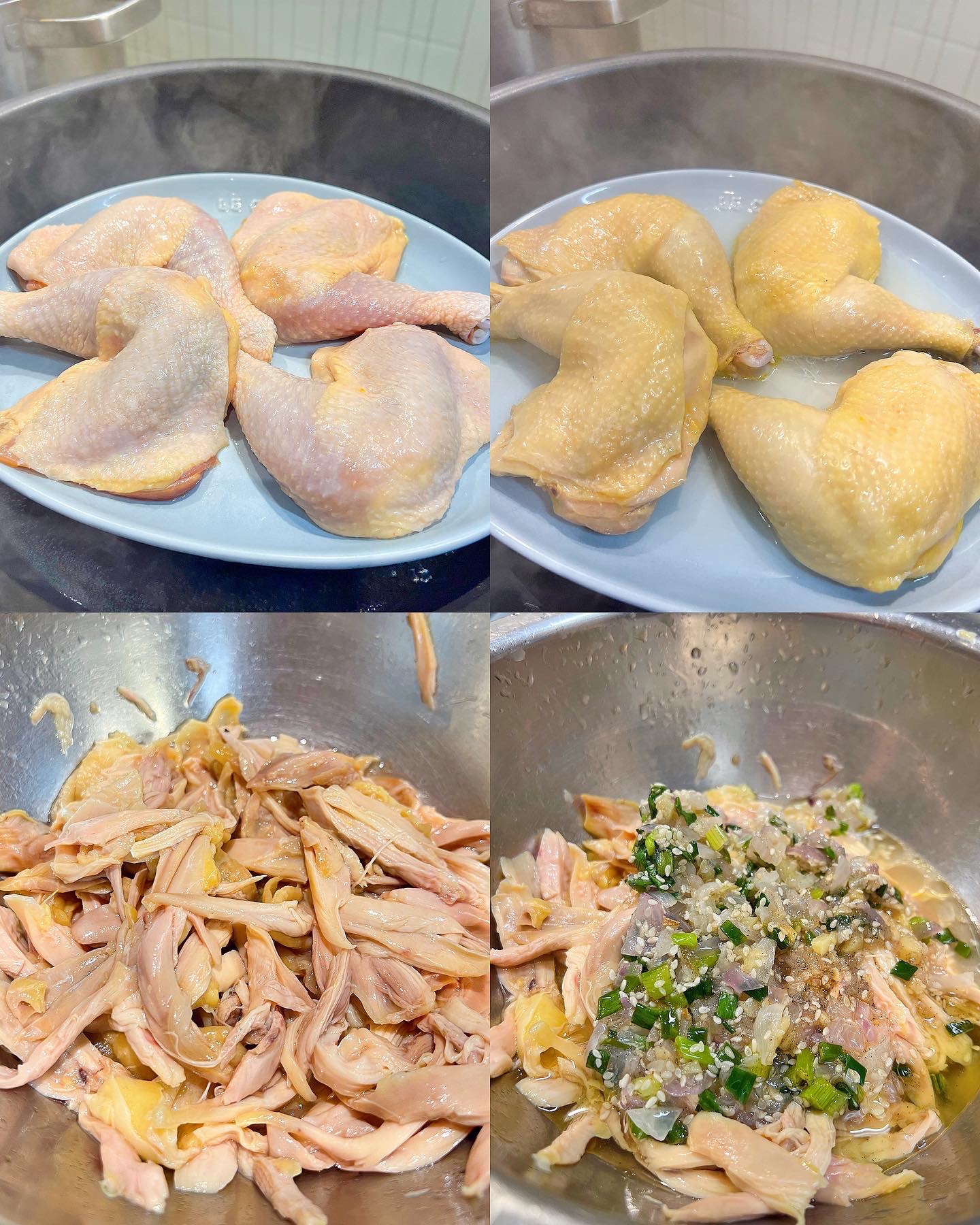 3) Soak the chicken into cold water, once cool enough to handle, shred chicken meat with hand.
