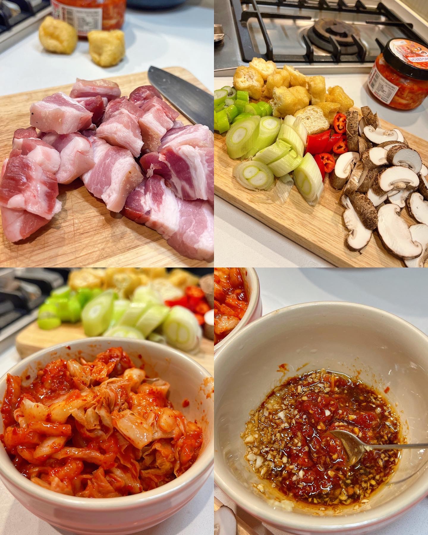 1) 豬腩肉切中粒,大蒽、洋蔥和紅尖椒切粒、冬菇切片,豆腐切件!泡菜用鉸剪,剪一剪!