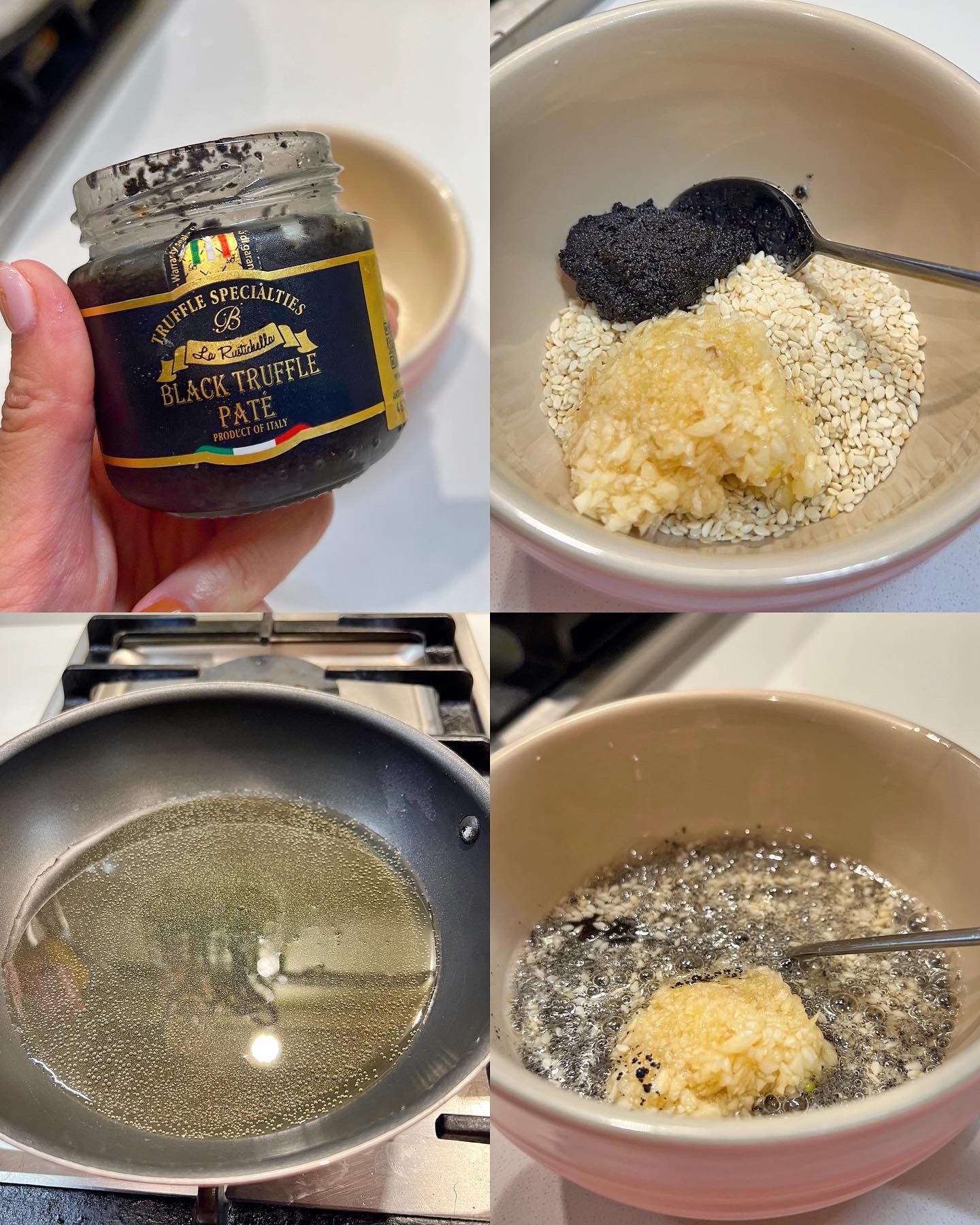 2) 蒜蓉、芝麻、黑松露醬和辣椒碎攪拌均勻,倒上滾油,之後再加入其他材料攪拌均勻即成醬汁!自己試吓味先!