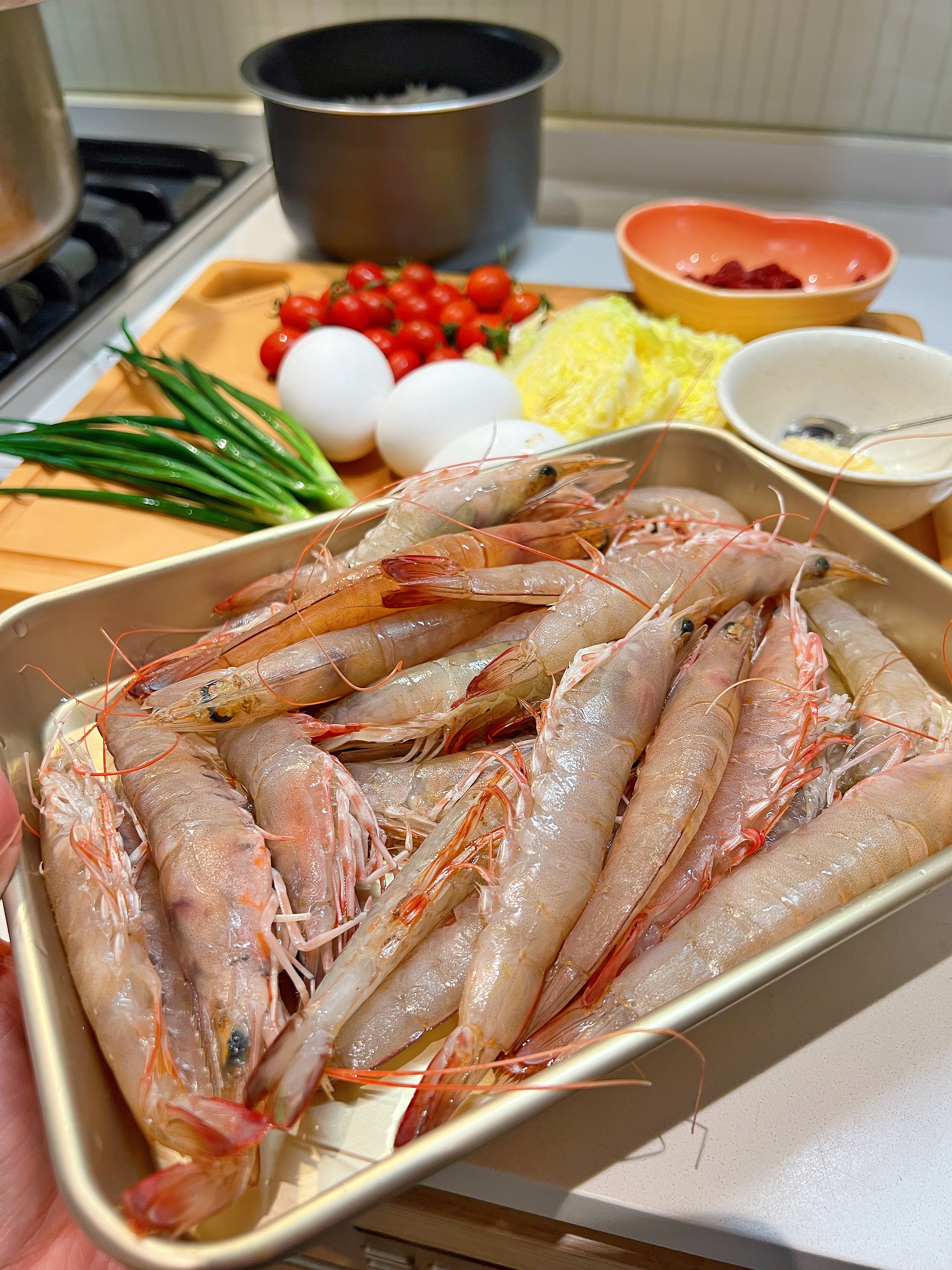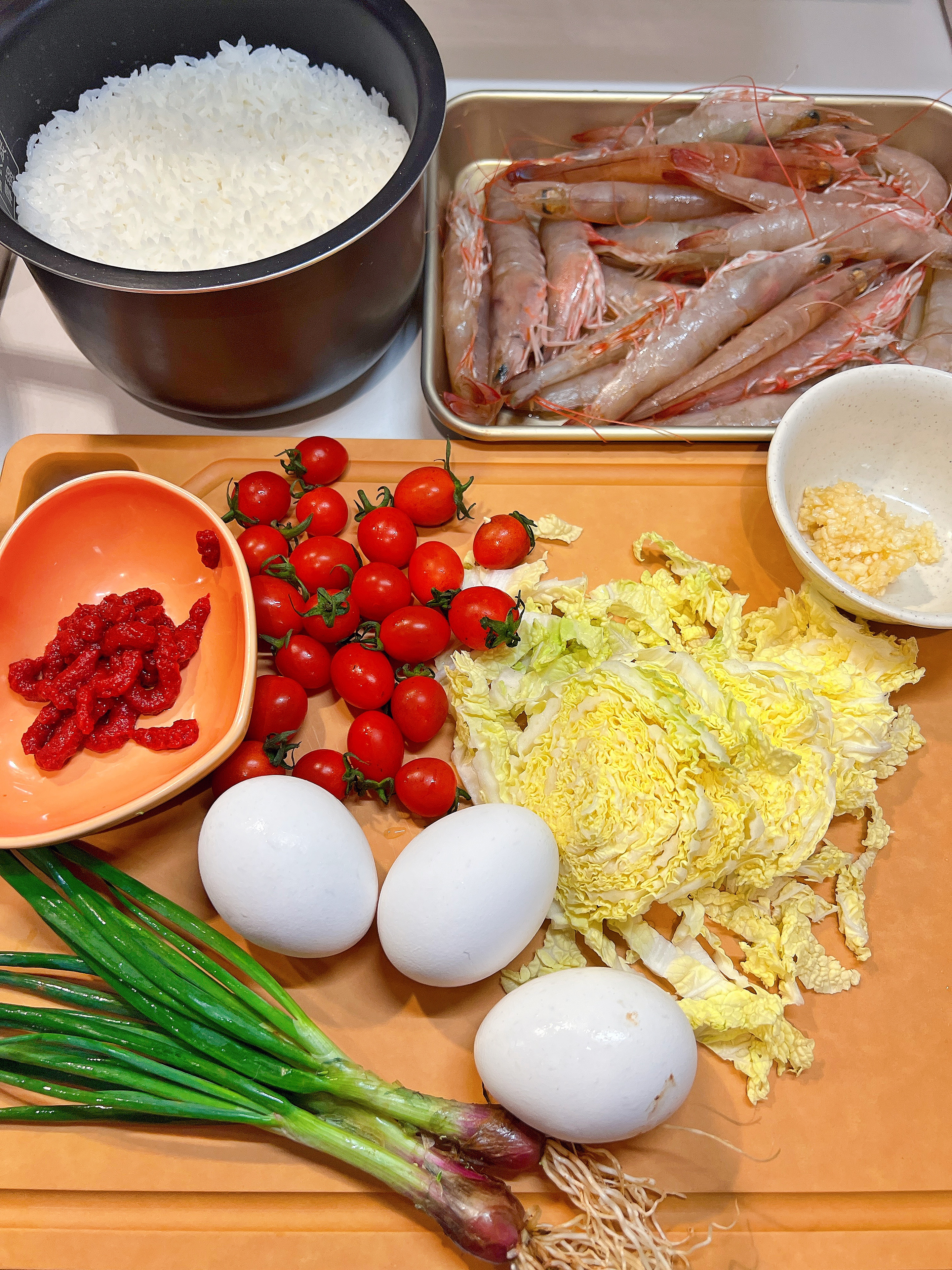 2) Remove and keep the prawn heads, peel the shell of the prawn, chop baby cabbage, halved cherry tomatoes