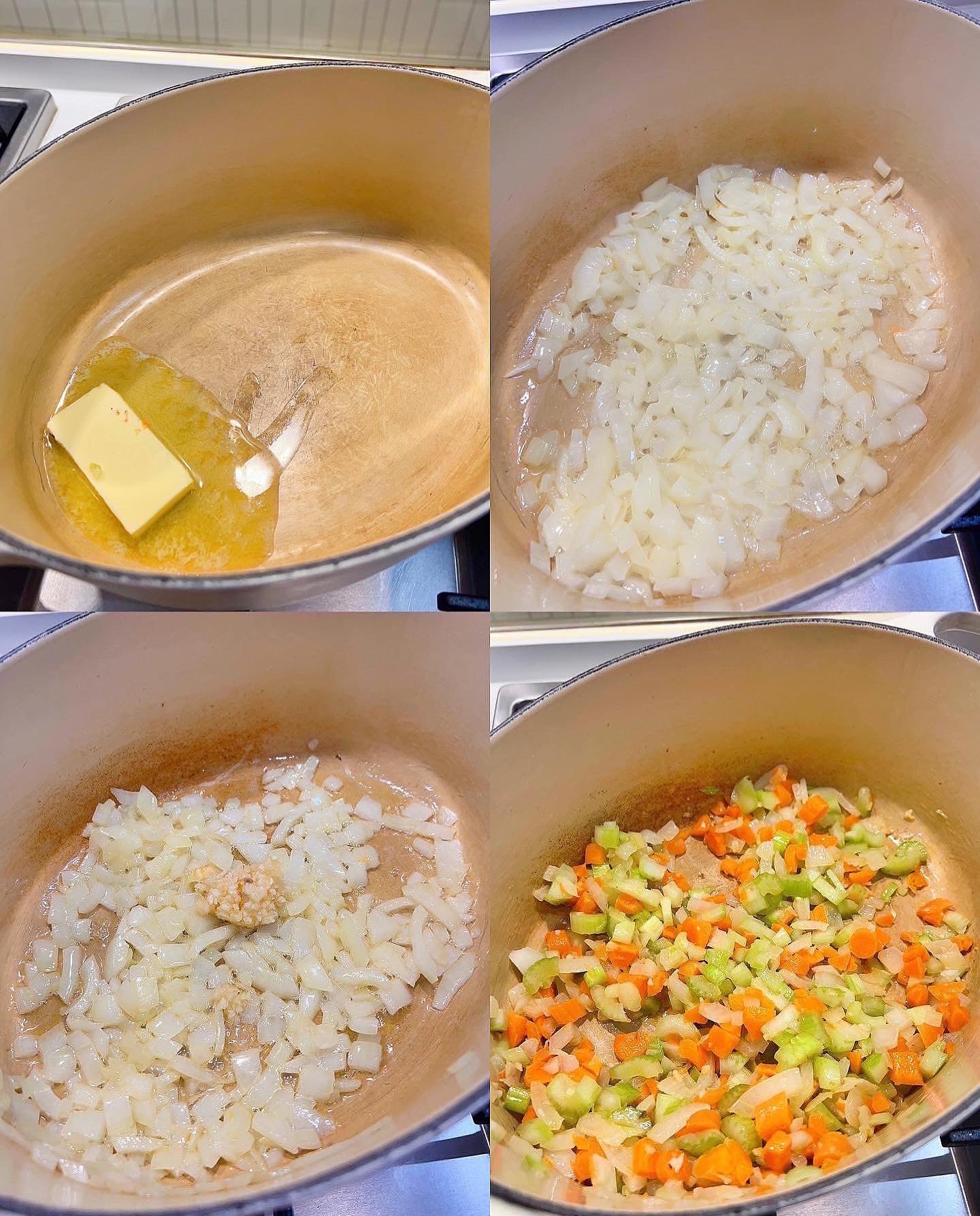 1) 洋蔥、蘑菇、西芹和甘荀切小粒