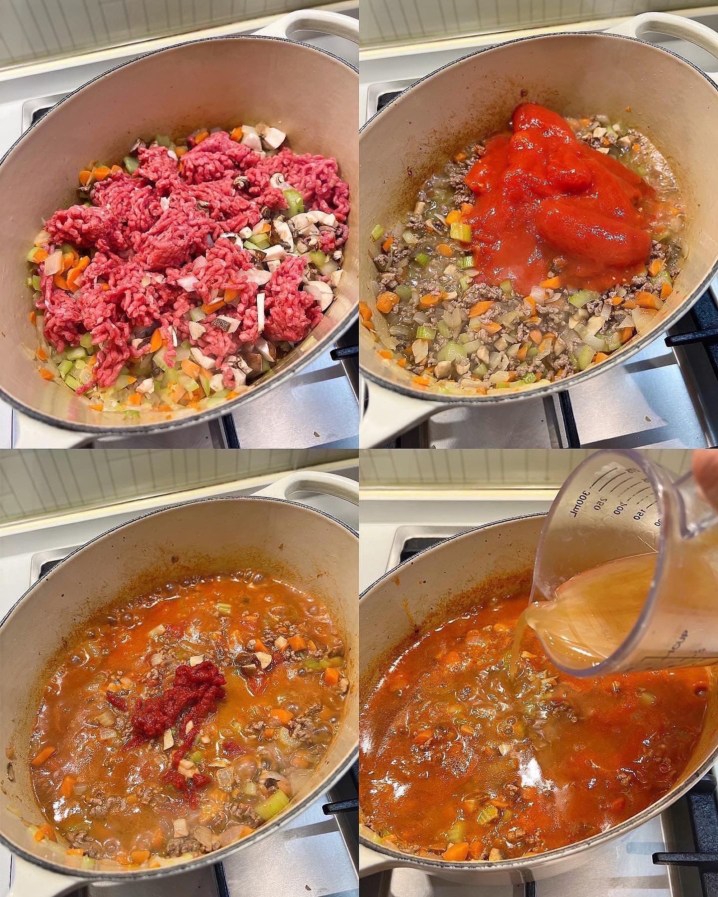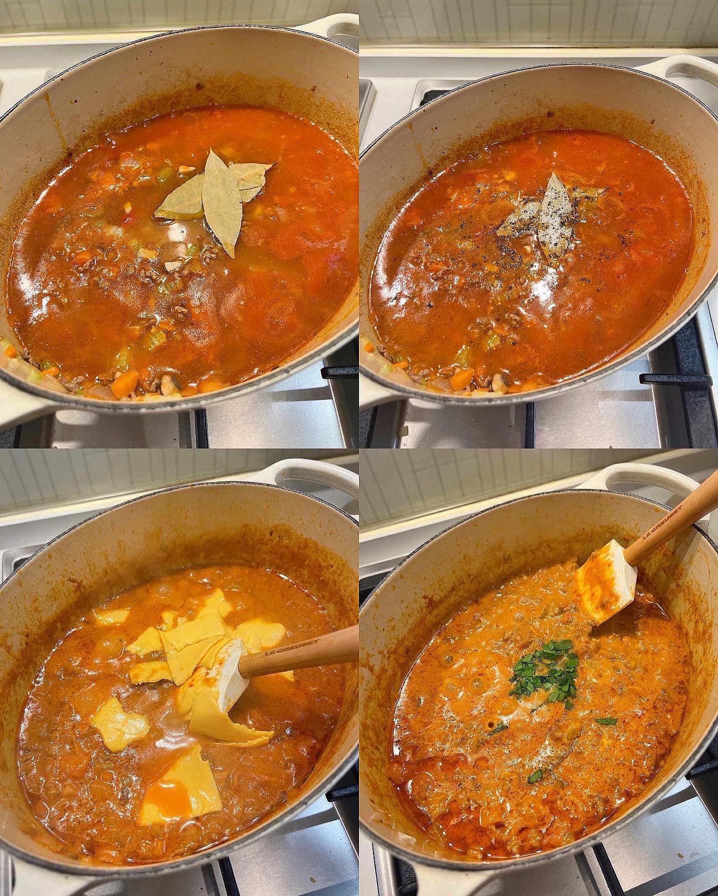 3) 加入月桂葉、牛肉湯、茄汁、紅酒、糖、鹽及黑胡椒煮滾,然後轉小火煮45-60分鐘至濃稠,月桂葉拿走