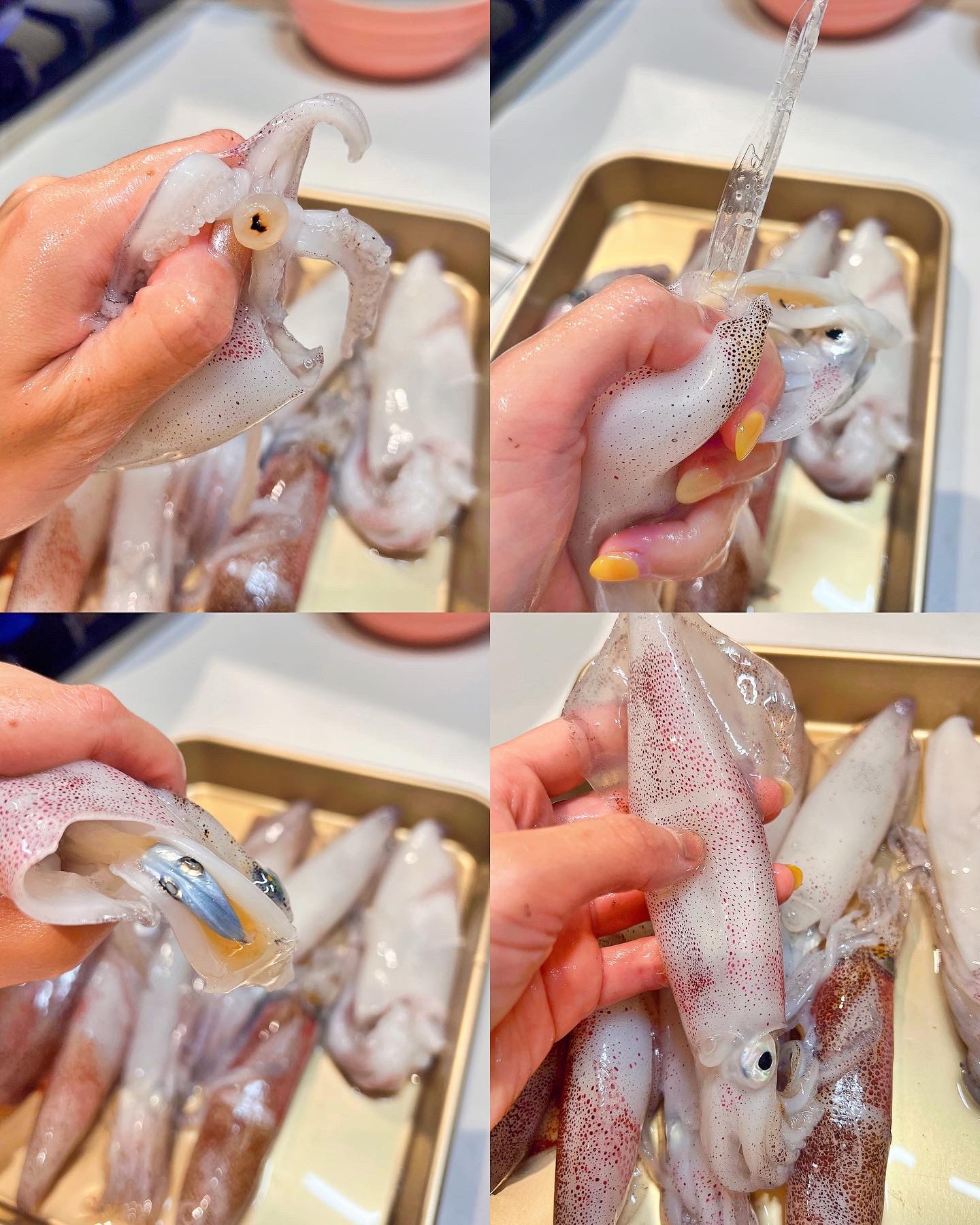 1) 魷魚仔清洗乾淨,去掉眼睛、嘴巴、背部軟骨和中間的墨汁袋!