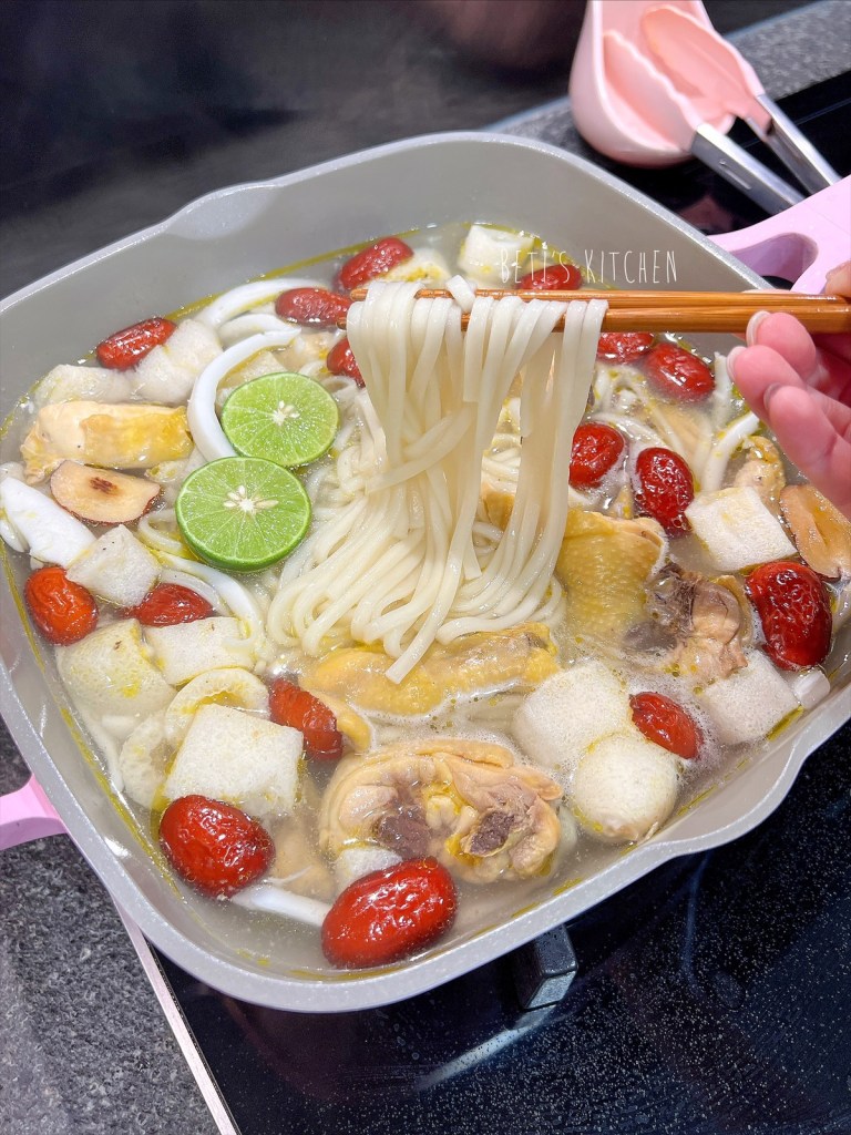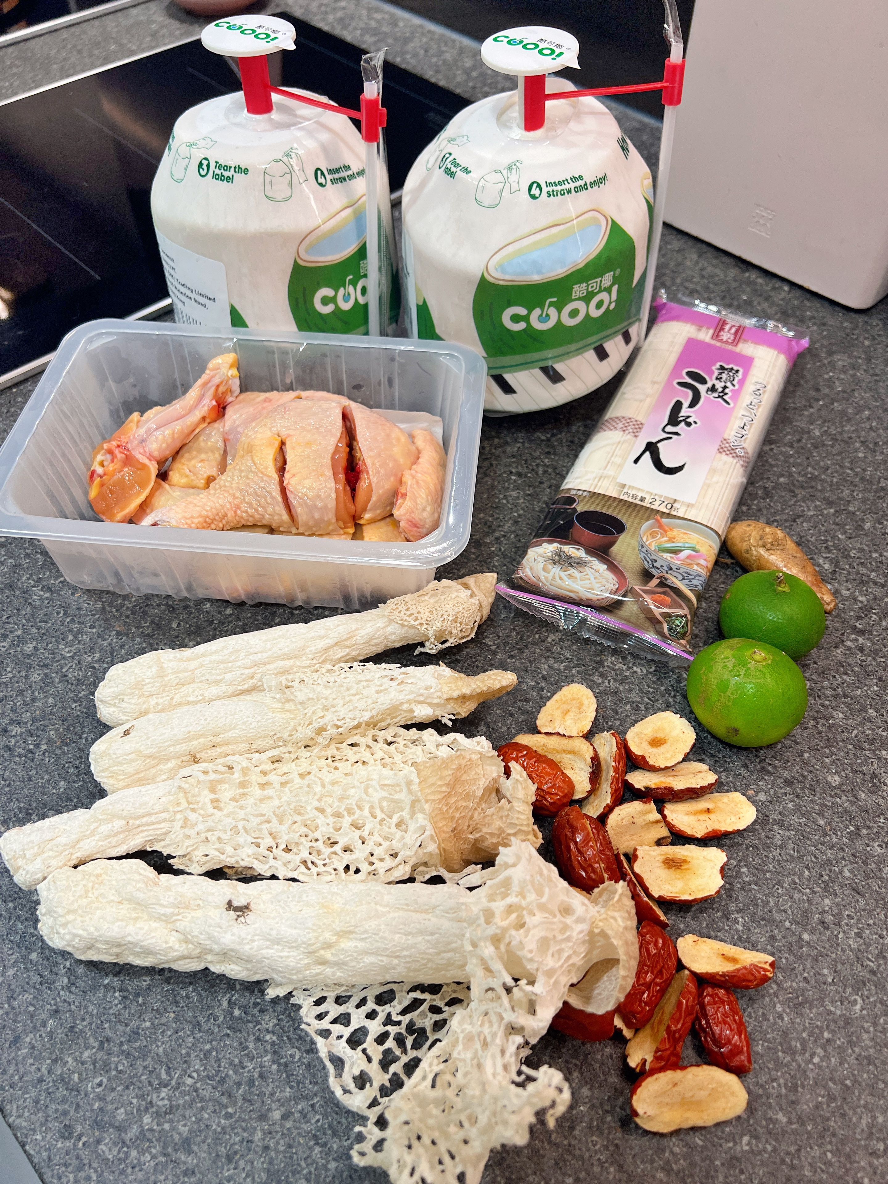 - 700ml椰青水 (如不夠可加入額外椰水或水) 煲滾後,加入竹笙、紅棗和椰青肉用小火煮5分鐘,然後再加入雞件煮8分鐘,再加入烏冬即成