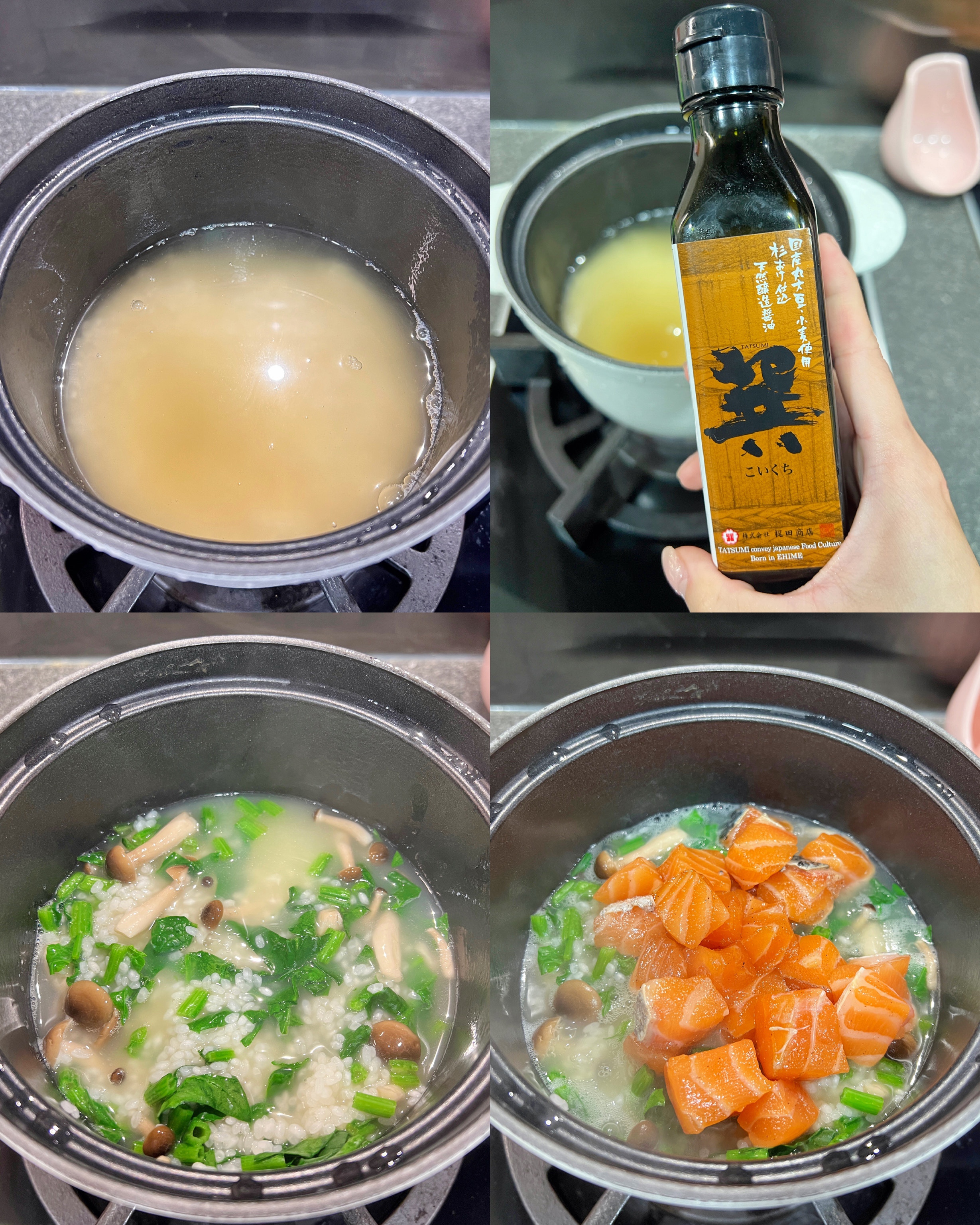 2)鍋中加入所有材料 (除三文魚),細火煮至滾後加入三文魚,繼續上蓋煮20-25分鐘