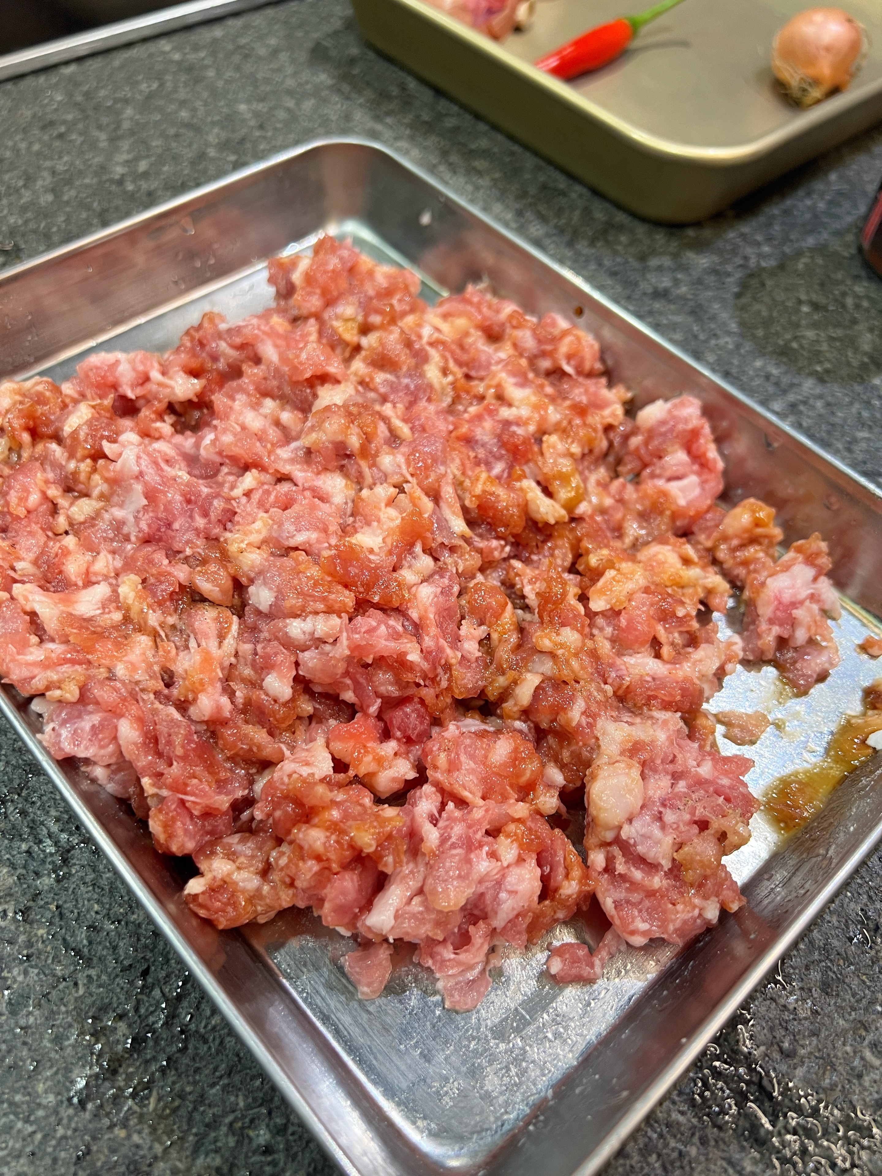 - 免治豬肉加入醃料醃10分鐘,麵條或烏冬預先用滾水煮上,瀝乾水份放在碗中備用
