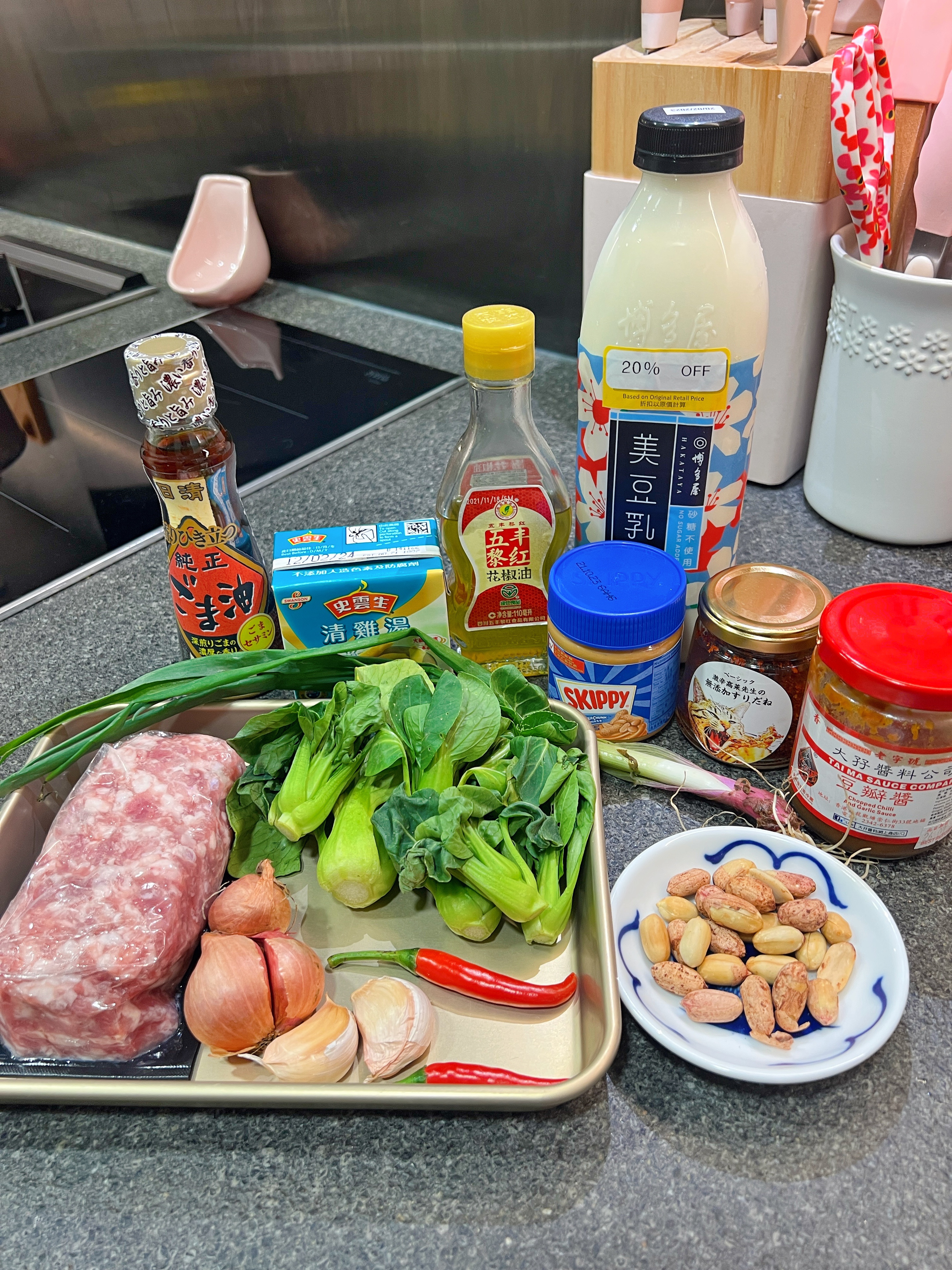 雞湯 300ml, 無糖豆乳 300ml, 花生醬2湯匙, 白芝麻 1湯匙, 辣椒醬 1茶匙(可省卻, 鹽 1/4茶匙, 生抽 1湯匙, 老抽 1茶匙, 糖 1茶匙, can麻油 1 茶匙