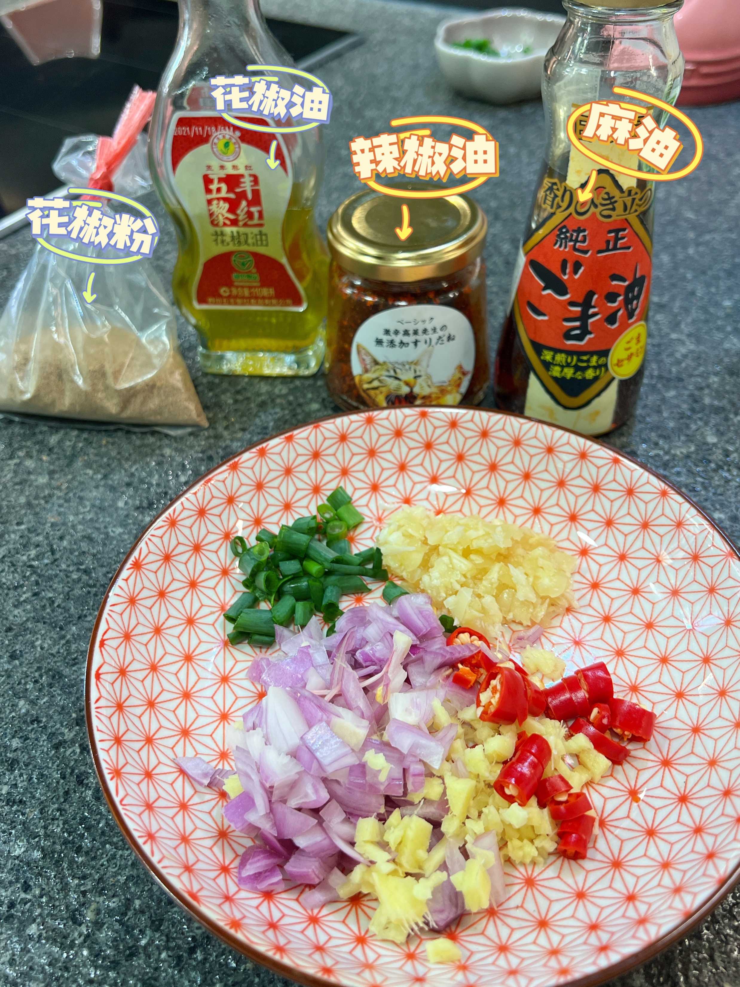 薑蓉 1湯匙, 蒜蓉 1湯匙, 蔥花 1湯匙, 乾蔥蓉2湯匙, 指天椒碎 1湯匙, 花椒粉 1湯匙, 花椒油 1湯匙, 油 4湯匙, 辣椒油/辣椒醬 2湯匙, 麻油 1湯匙, 砂糖 1茶匙, 生抽 1湯匙, 老抽 1茶匙,