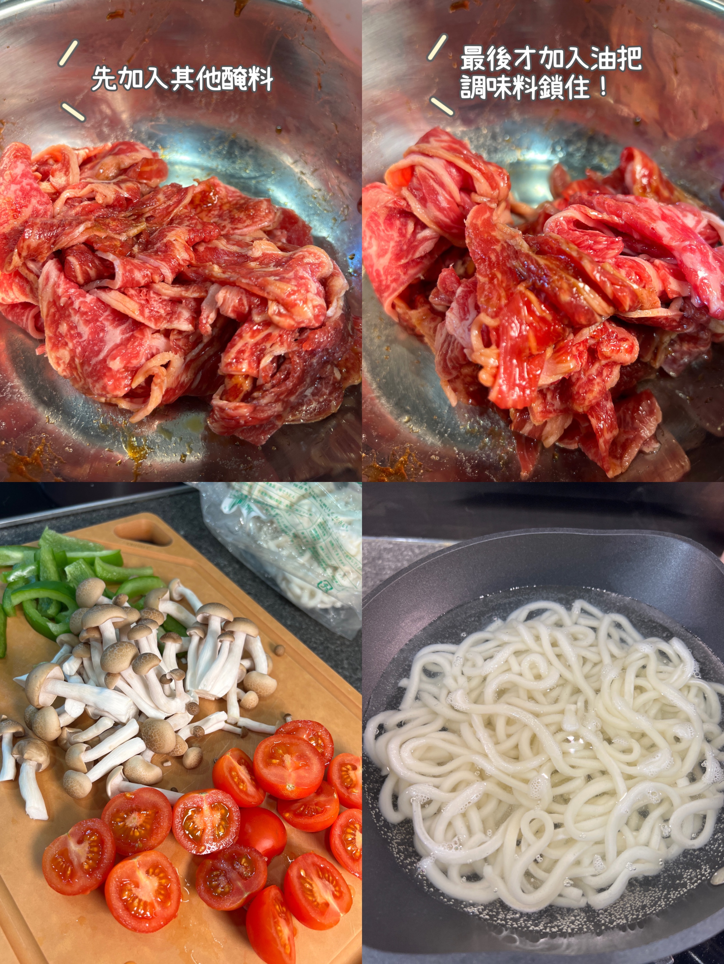 1) 肥牛加入蠔油、生抽、糖、胡椒粉攪拌均勻!之後再加入油醃15分鐘!