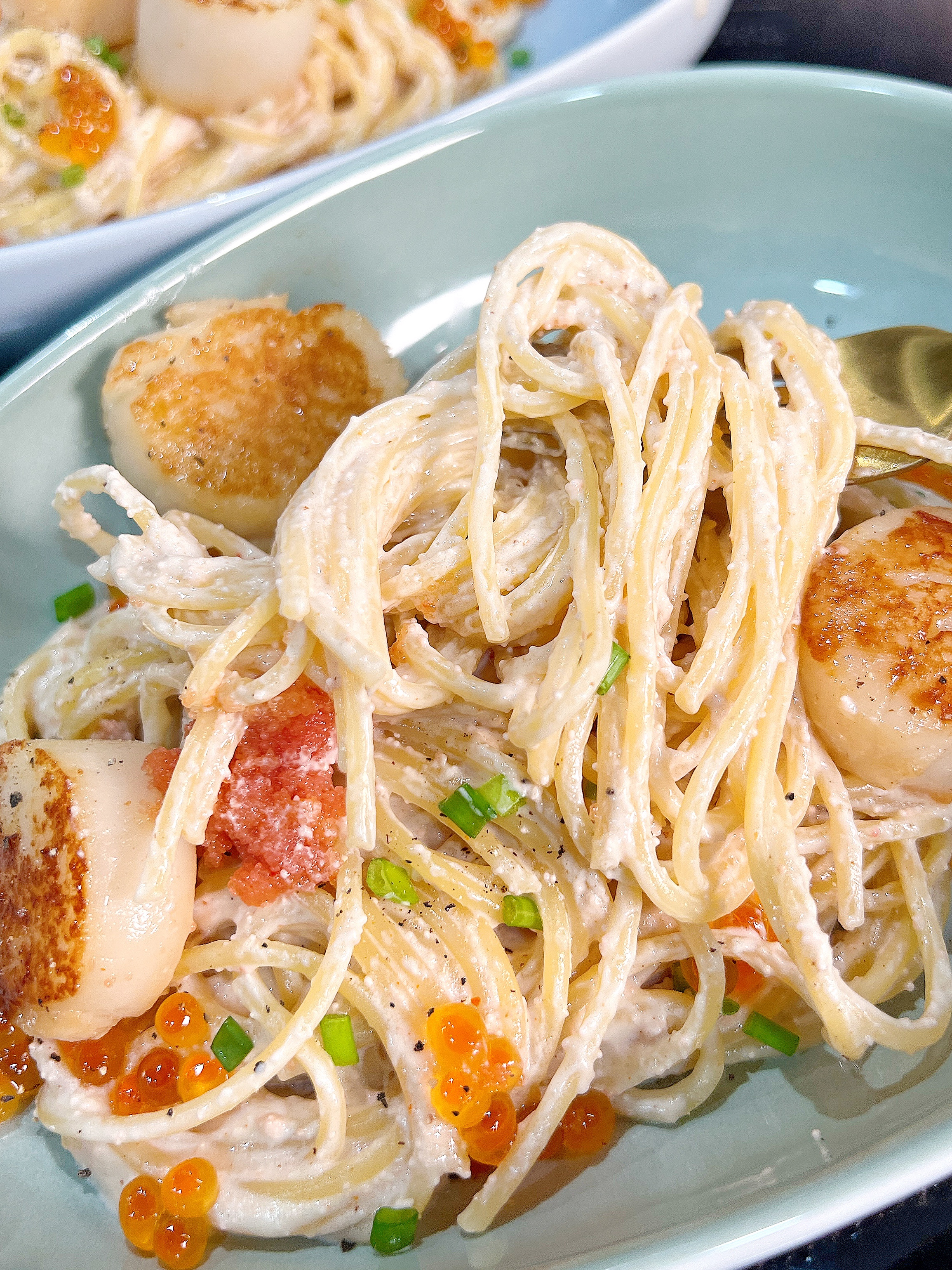 5)細火下意大利粉!和明太子汁撈在一起,煮至醬汁濃稠,再加上帶子、蔥花和三文魚子作裝飾即成💞