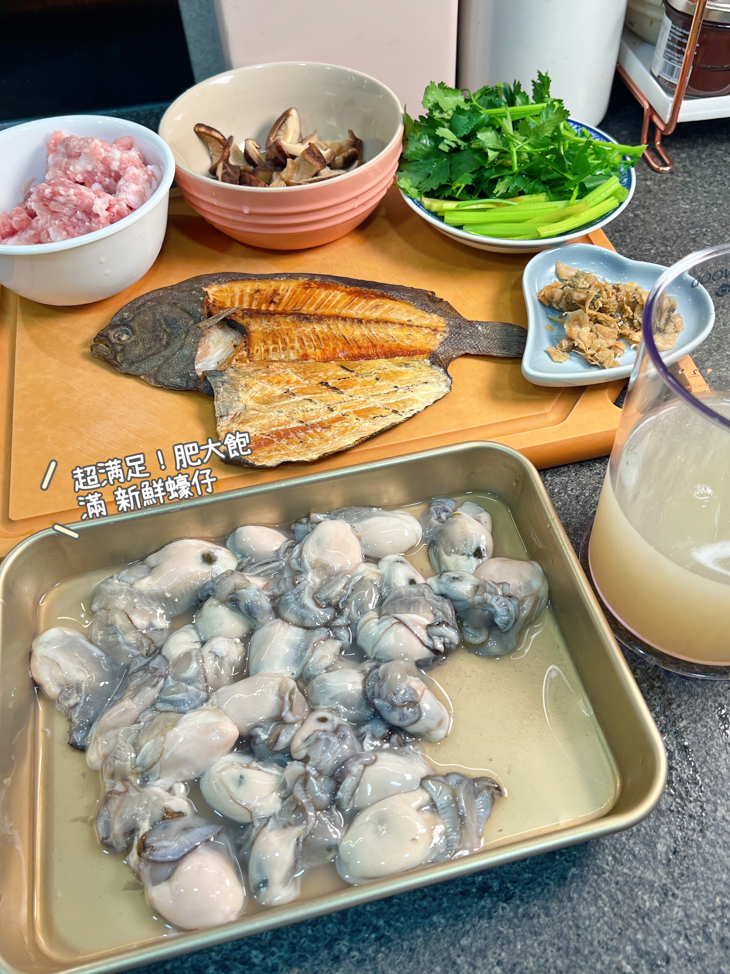 1) 豬肉加入醃料醃5分鐘,冬菇用水浸淋切片,蠔仔用生粉洗淨