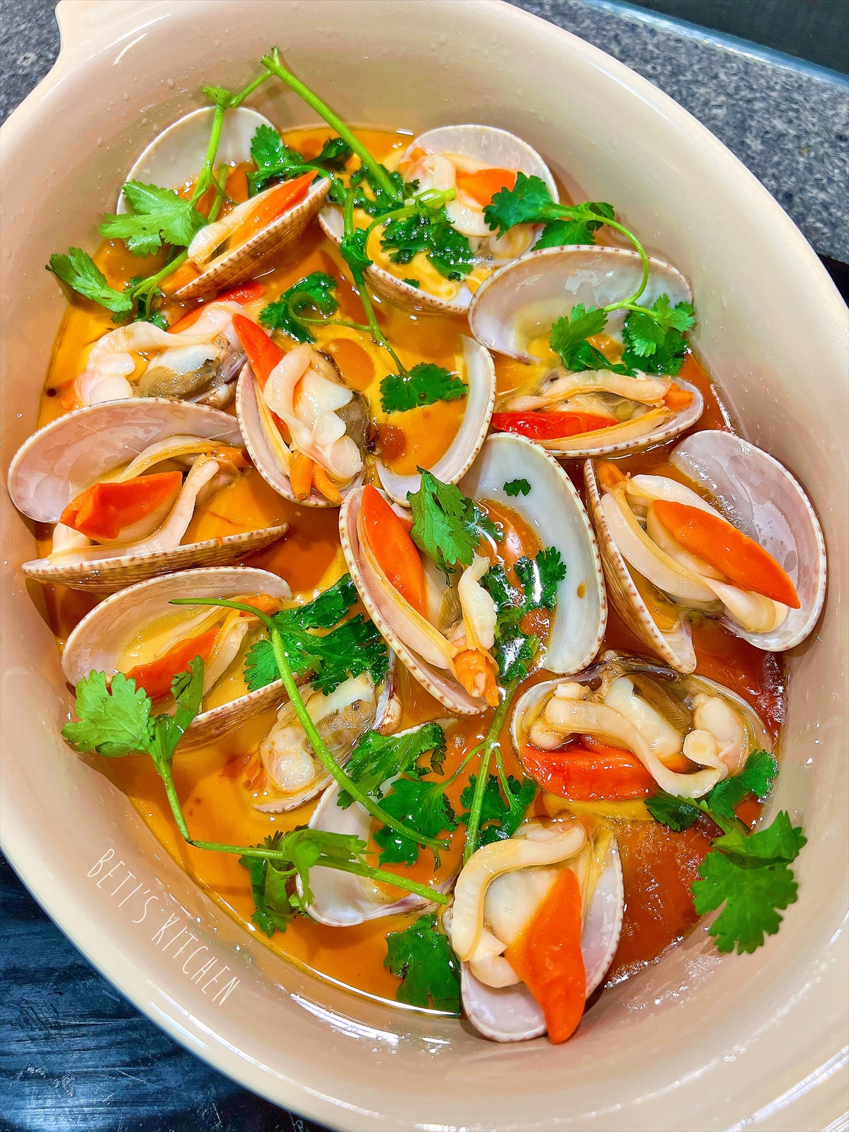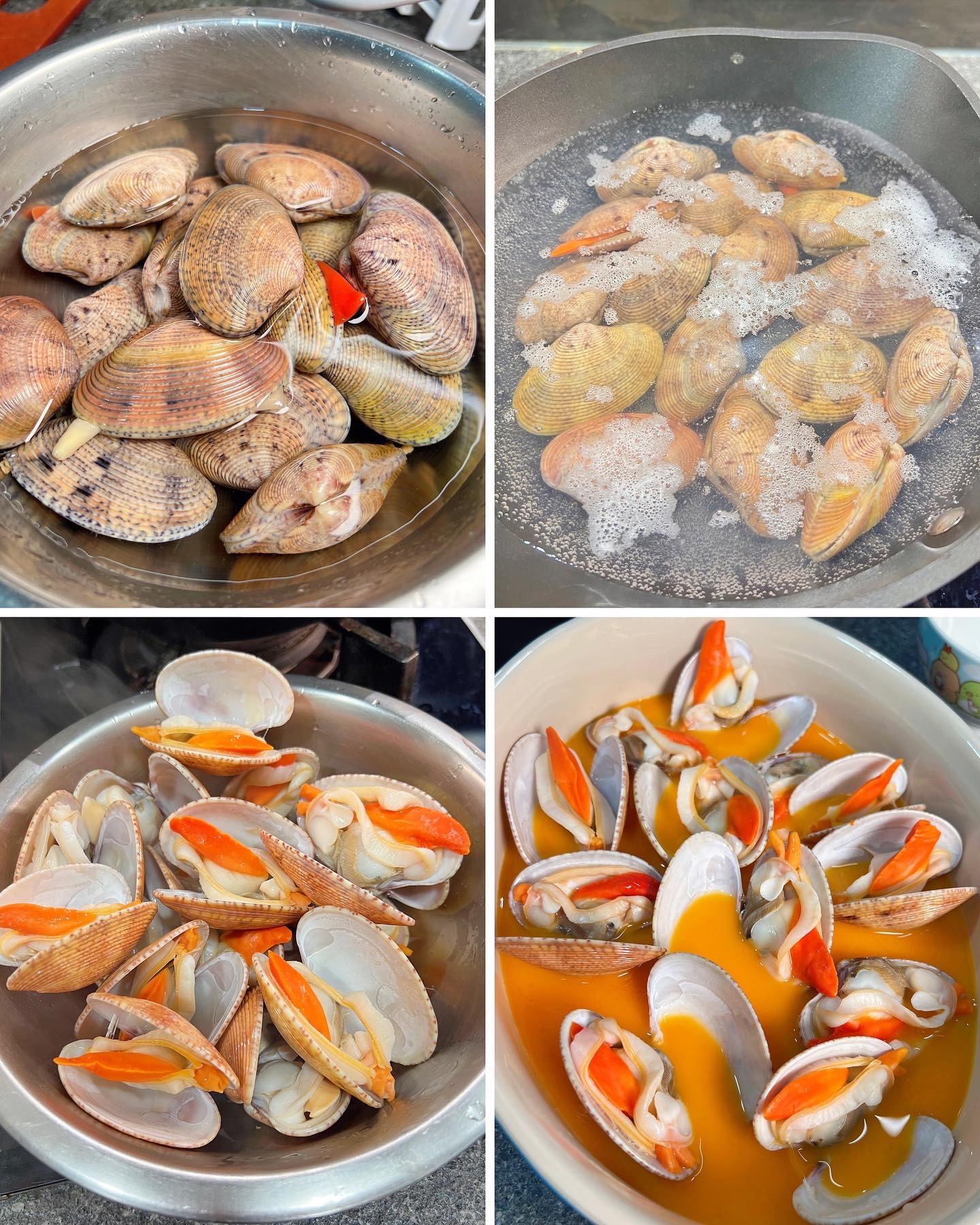1) 花甲先加鹽浸一小時吐沙,不過優質花甲多數無乜沙!熱水煲滾,把花甲加入,一開殼立刻拿起!避免過熟!整乾少少先加入蛋中,否則會太多水