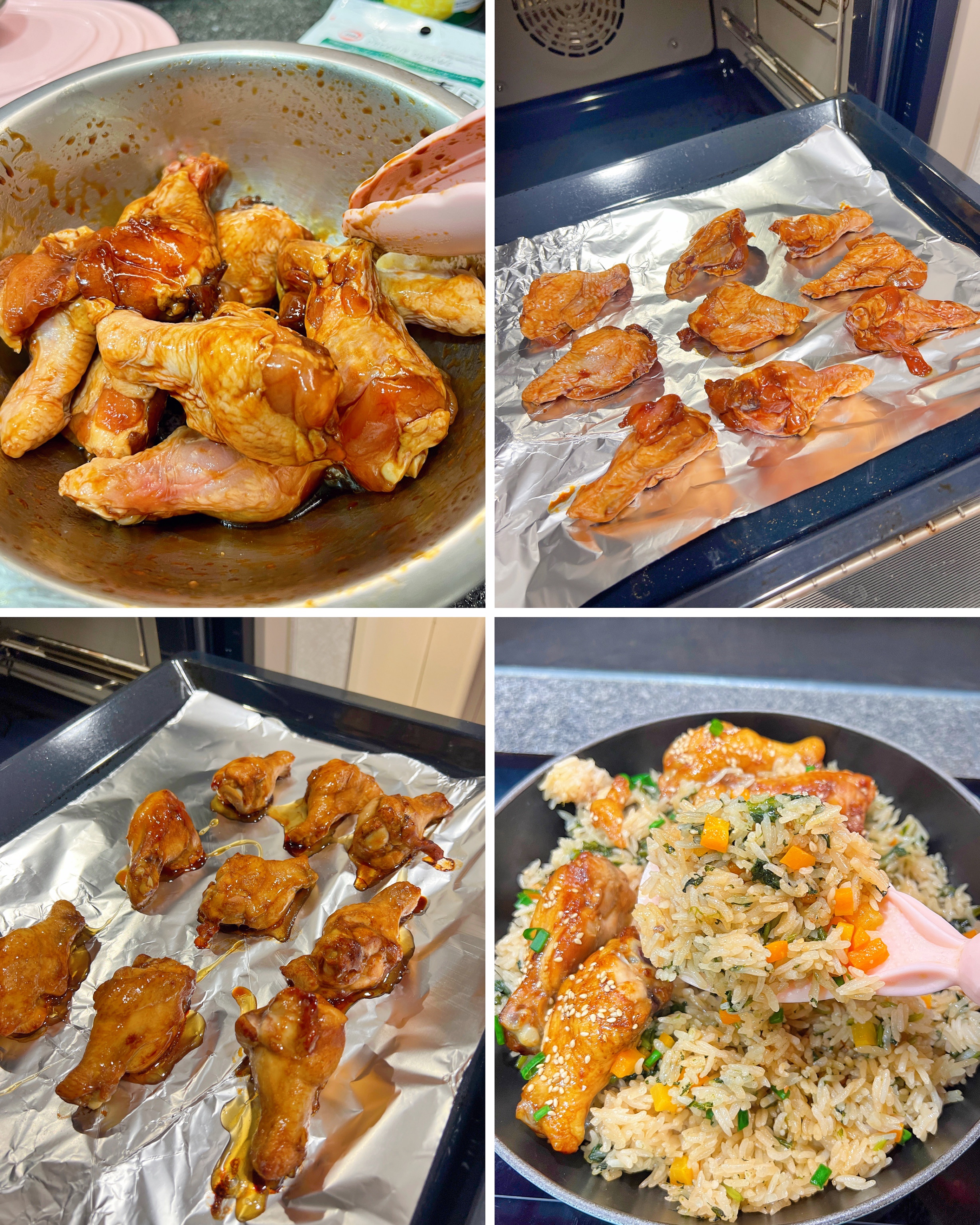 4) 焗盤上鋪上牛油紙或錫紙,掃上少許油,放入雞翼180°C焗20分鐘,搽上蜜糖再220°C焗5分鐘即可,可表面加上白芝麻,然後把雞鎚放在飯上即成!