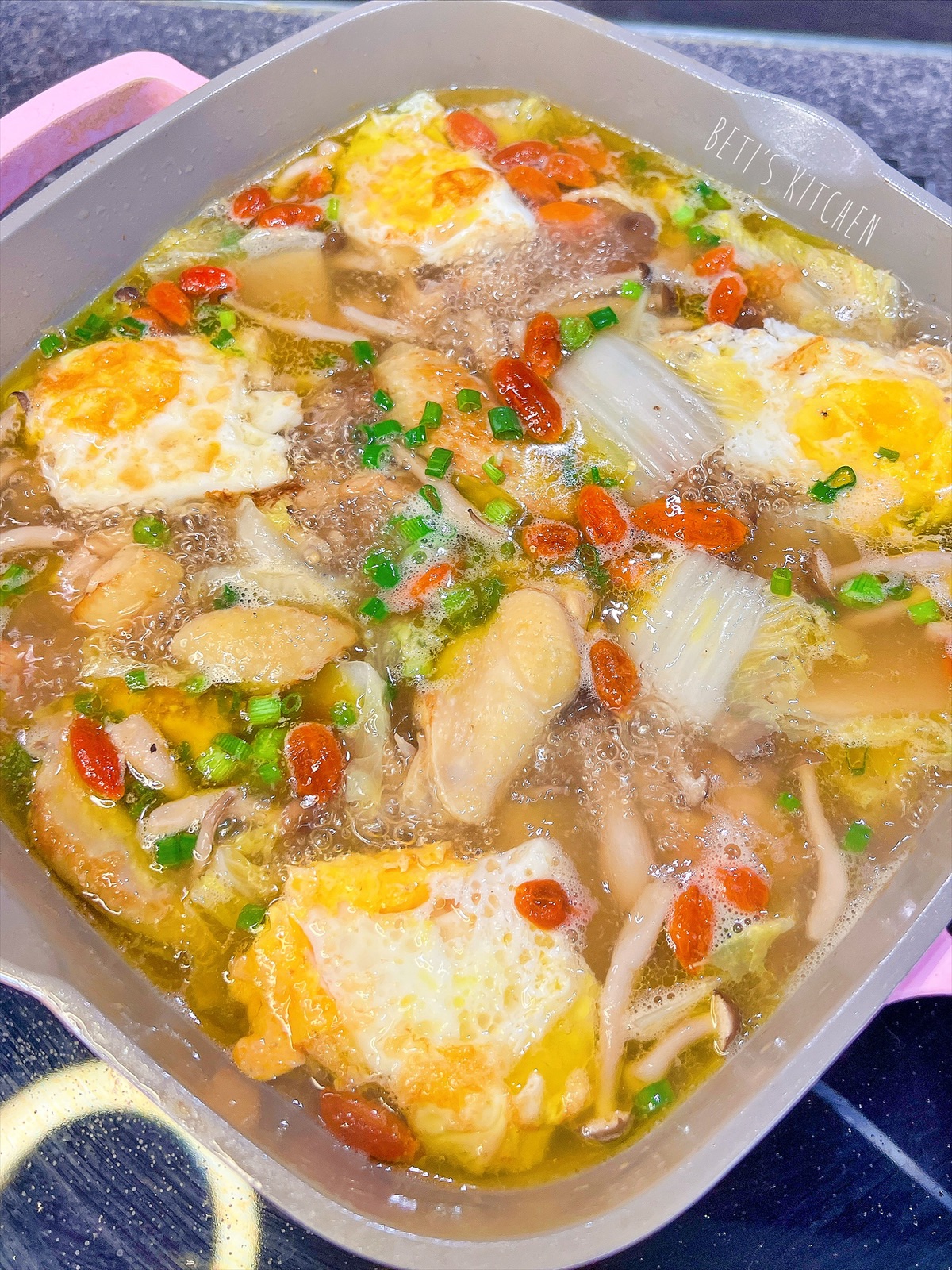 - 熱鍋下油,先把雞蛋煎香,然後拿起備用!之後同一隻鍋中加入雞肉炒香3分鐘,然後倒入滾水,再加入娃娃菜和本菇,中小火煮15至20分鐘,最後加入杞子、蔥花和少許鹽即成!