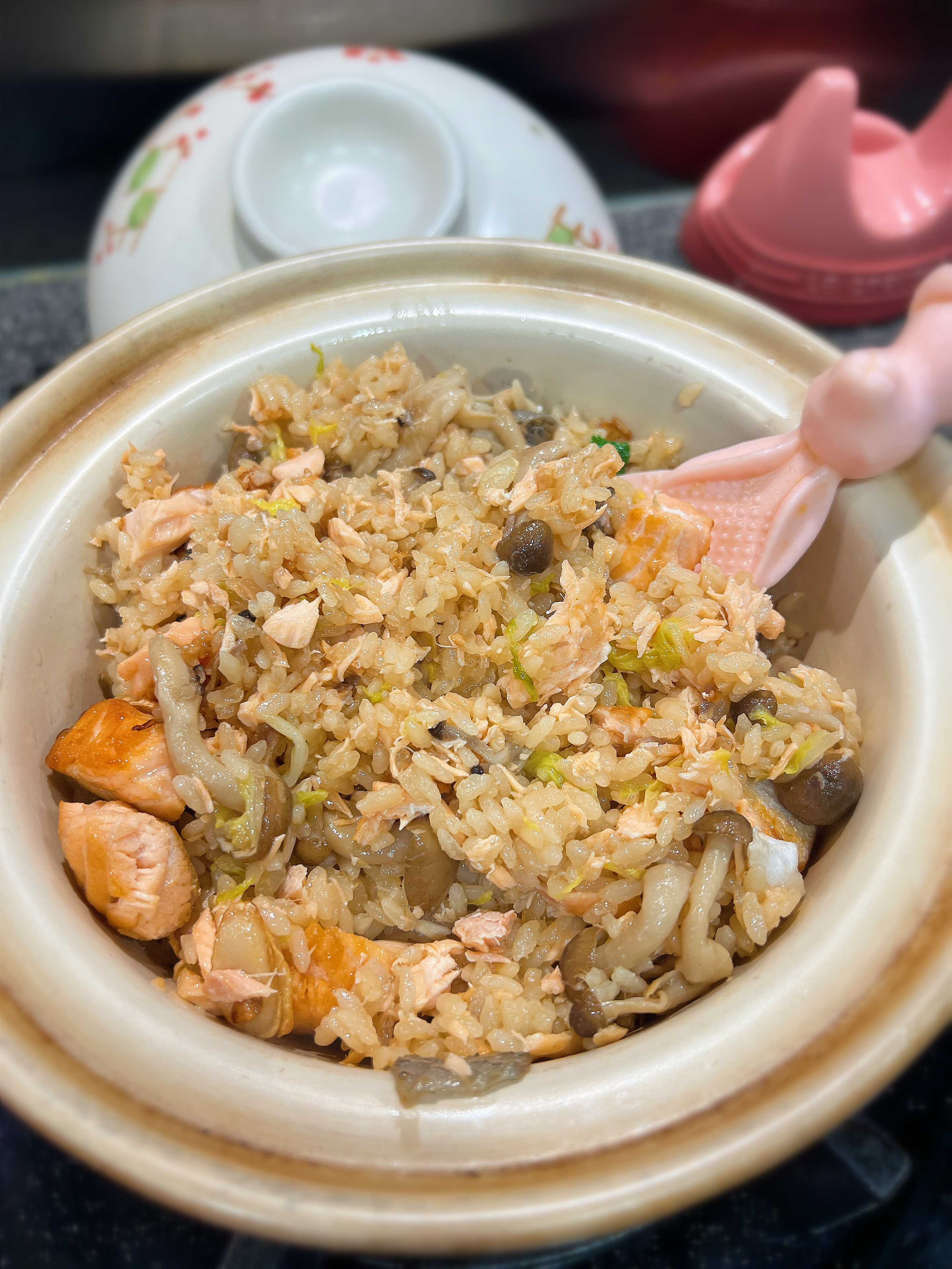 4)把三文魚粒加入,繼續煮10分鐘,再加入蔥花即成!