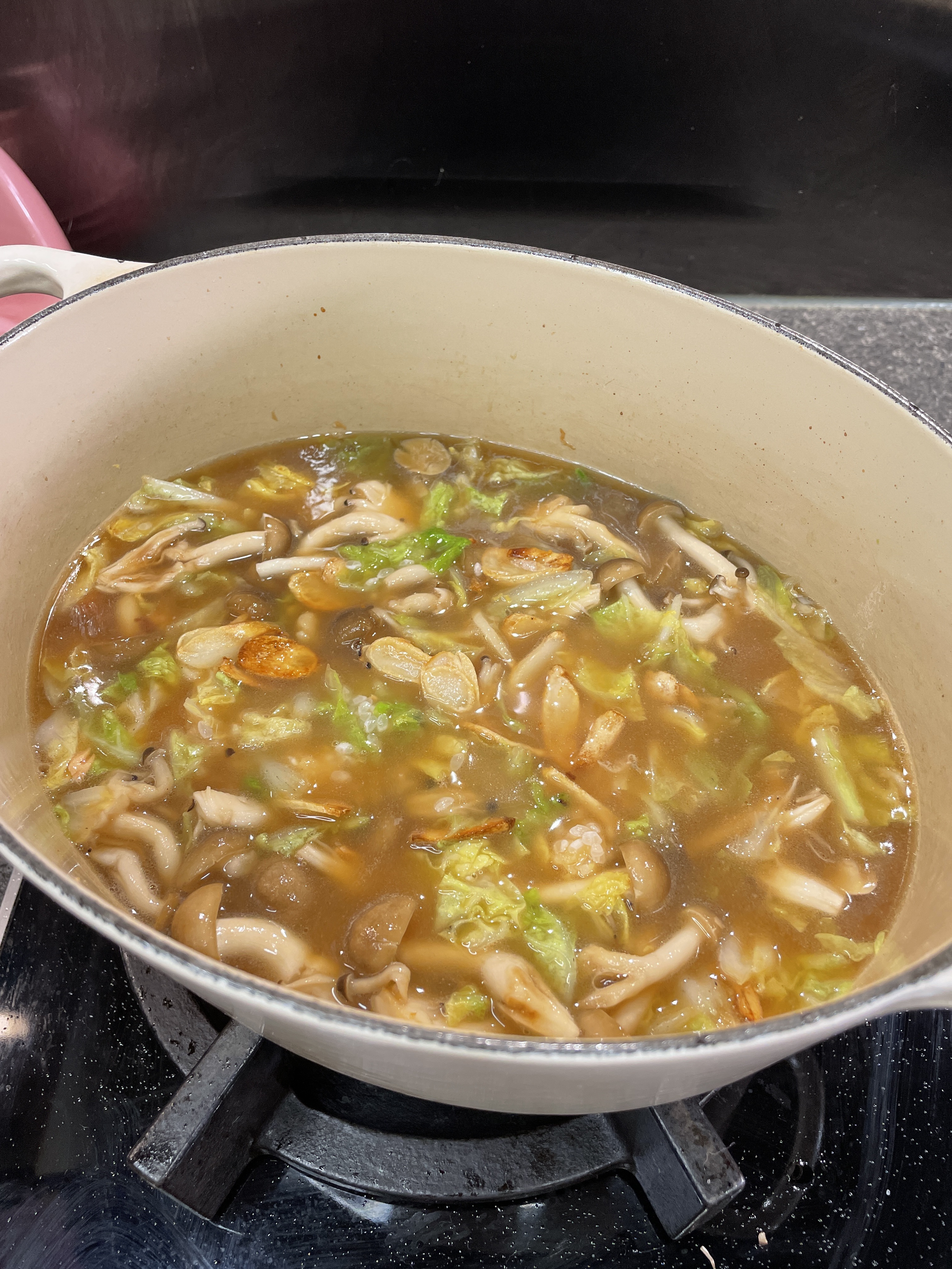 3)本菇和娃娃菜炒香,然後加入麵豉和醬油炒勻,然後再加入米、蒜片和水,上蓋細火煮15分鐘!