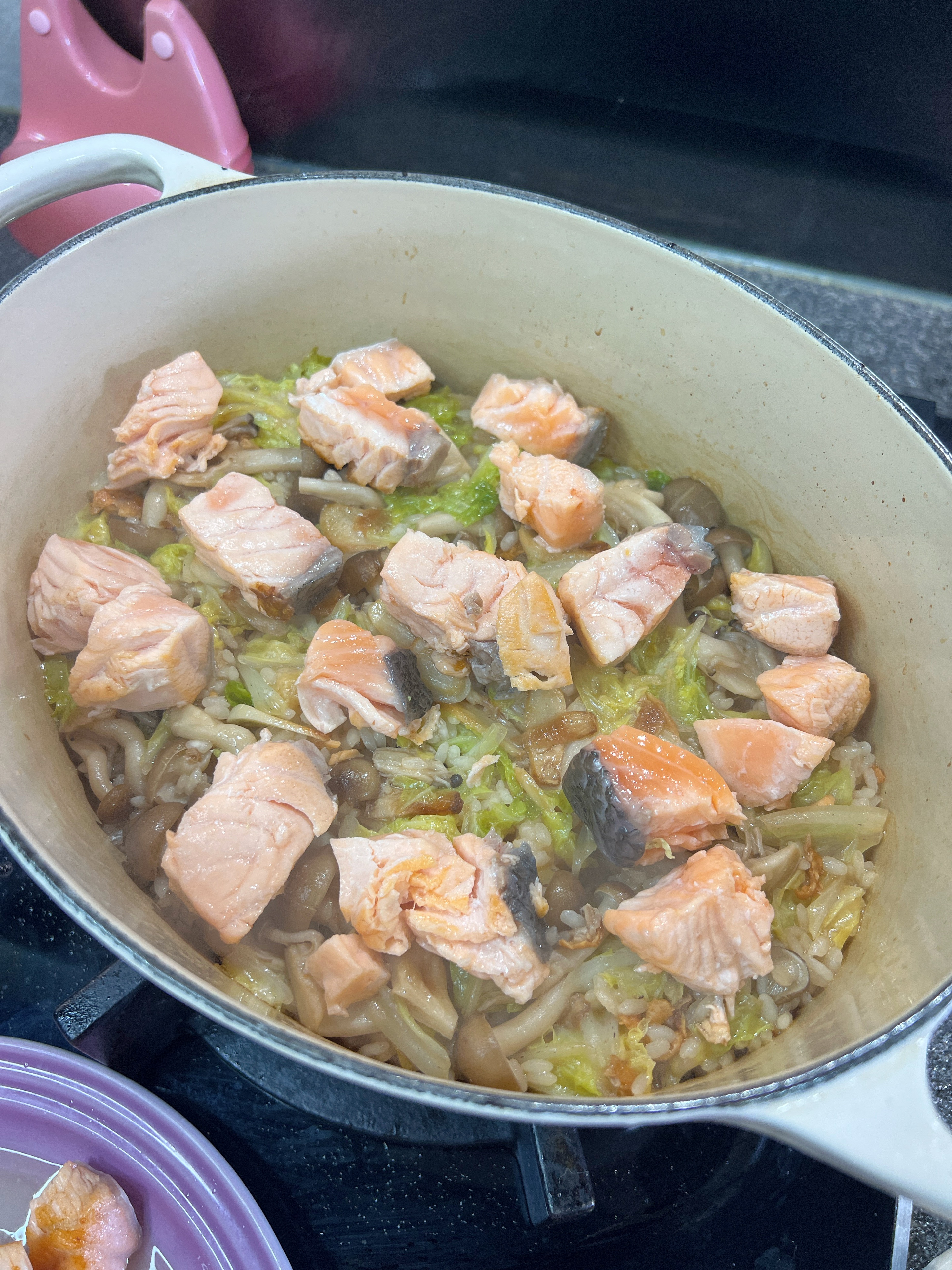 1) 三文魚切中粒,加入到少量鹽醃5分鐘!菇切去根部撕開,娃娃菜洗淨後切碎!白米洗淨!