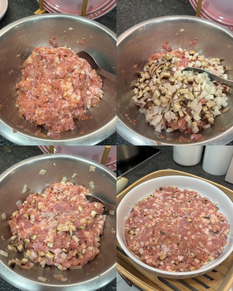- Mix the ground pork with all the seasonings, stirring in one direction until it becomes sticky. Soak the dried mushrooms and dried squid, then chop them into small pieces. Peel and chop the water chestnuts. Then add them all to the seasoned pork and mix well.