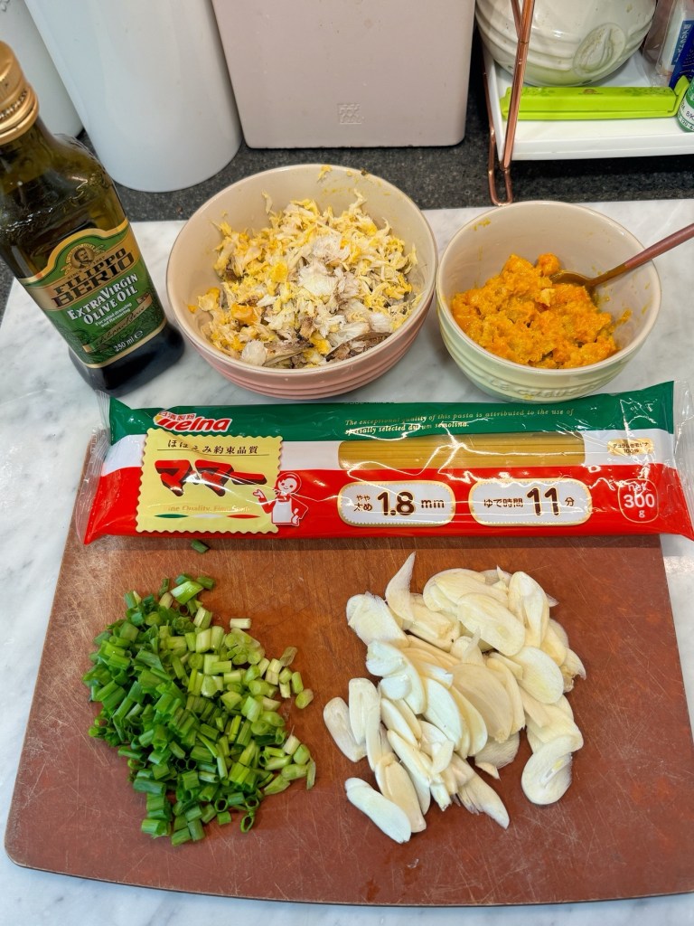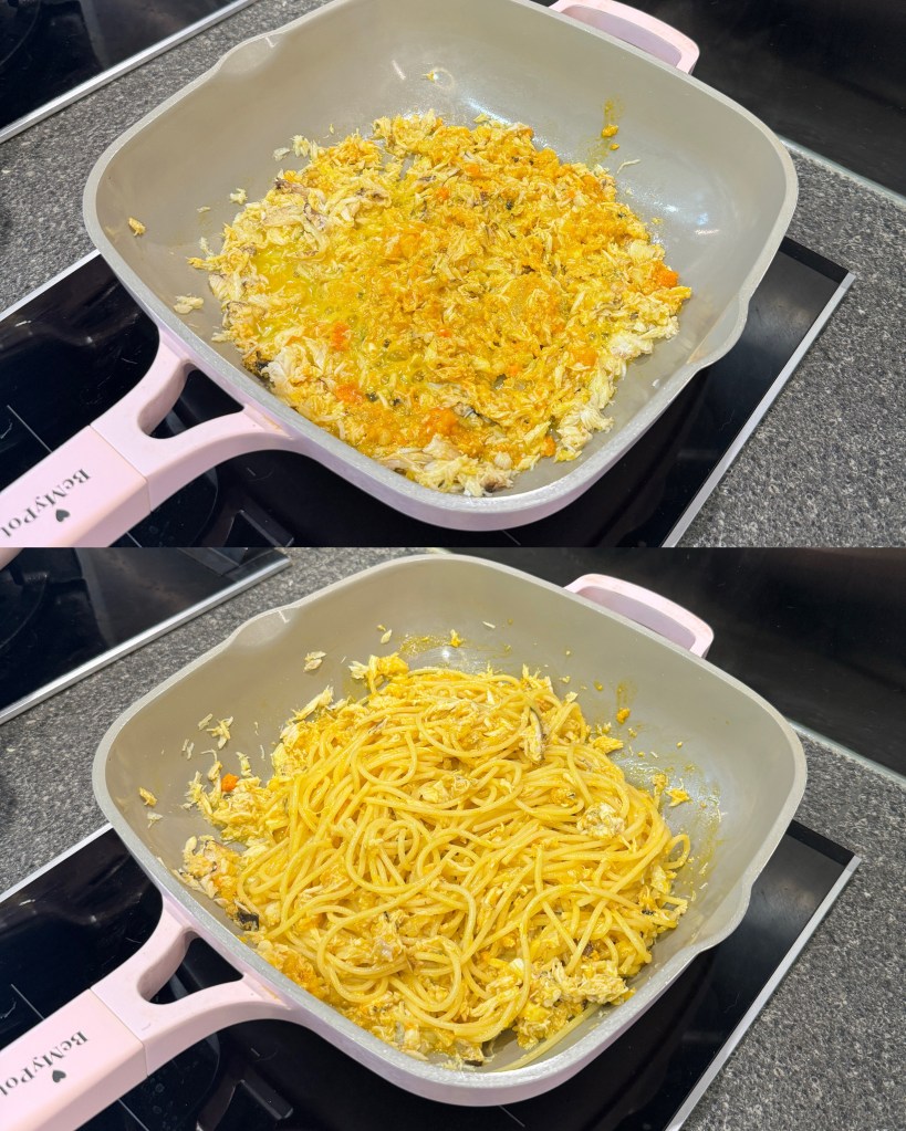 - In a hot pan, add olive oil, then stir-fry the crab meat and crab roe until fragrant. Next, add the pasta and reserved pasta water, mixing well. Season with sea salt and black pepper, then add the chopped green onions and garlic slices, and it’s done!