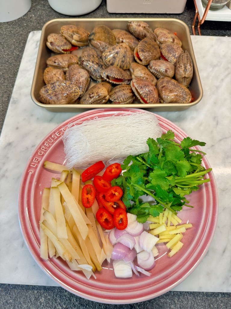 1) 花甲用鹽水浸半小時吐沙,粉絲用熱水浸淋,大頭菜預先浸15分鐘