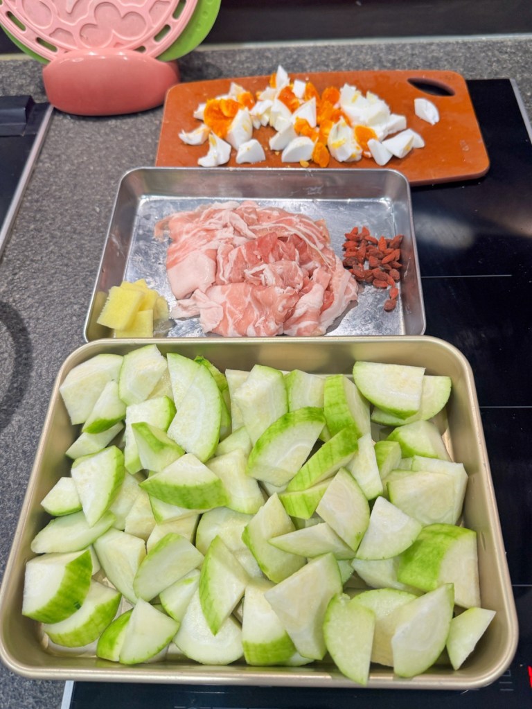 - Sauté ginger and salted eggs in oil. Add boiling water, hairy melon, pork, and goji berries. Simmer for 15 min.