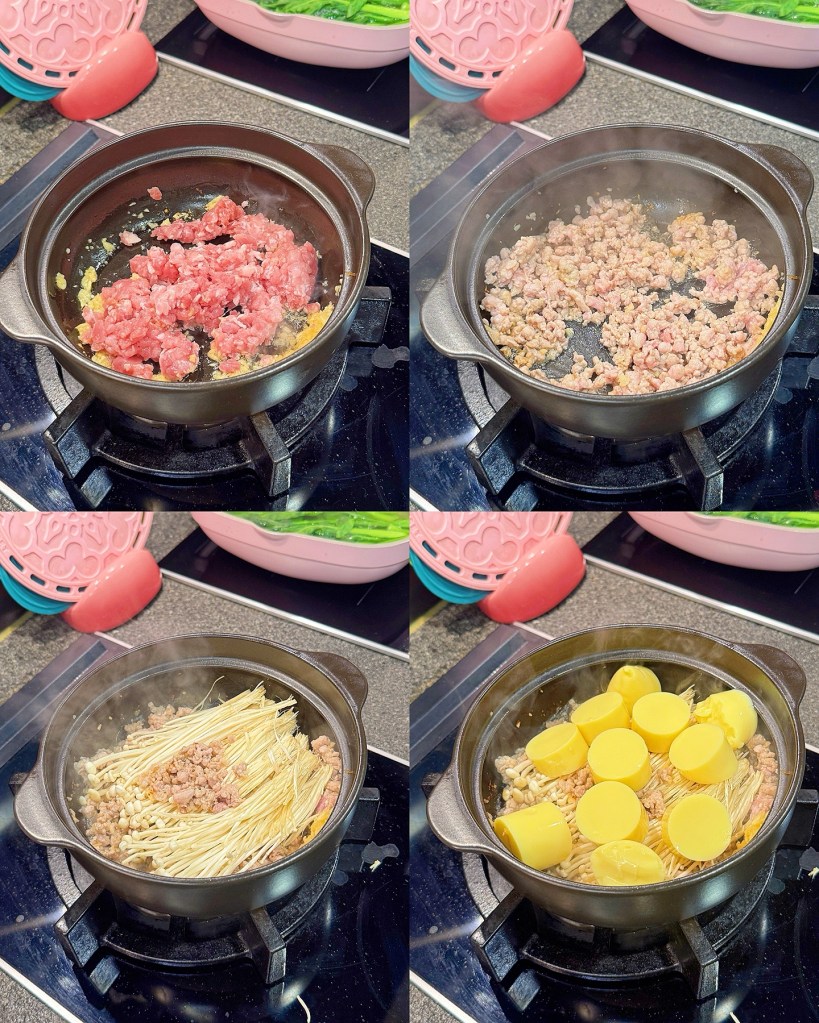 - 熱鍋下油,爆香蒜蓉,然後加入豬肉碎炒香至變色,之後放上金菇和玉子豆腐,倒入調味料,中火煮6分鐘,再灑上蔥花即成!