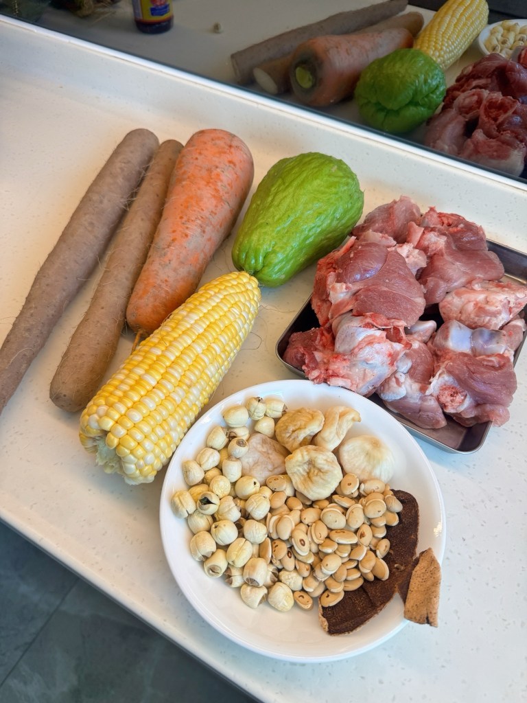 1) 乾貨浸15分鐘後沖水,紅蘿蔔和新鮮淮山去皮切塊,合掌瓜和粟米切塊,陳皮用刀刮去囊